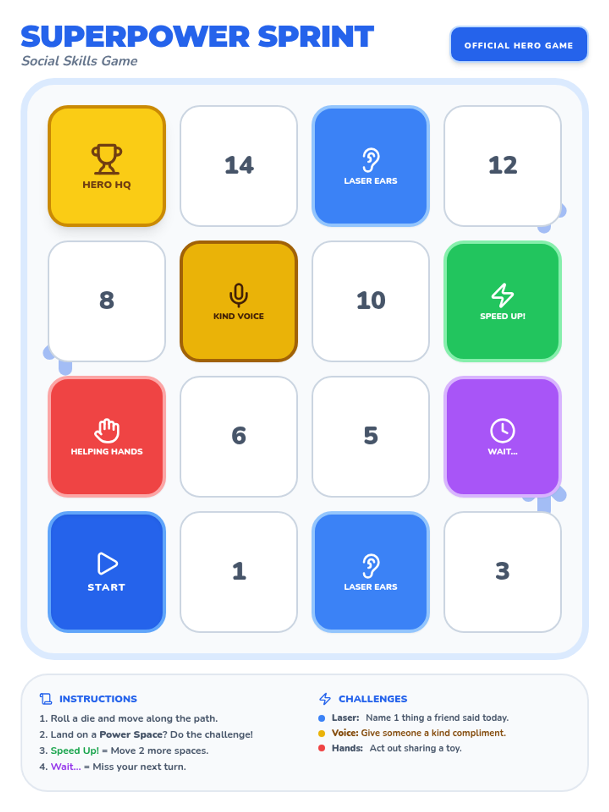 A printable board game called 'Superpower Sprint' where students practice social skills like listening, sharing, and kindness to reach Hero HQ.