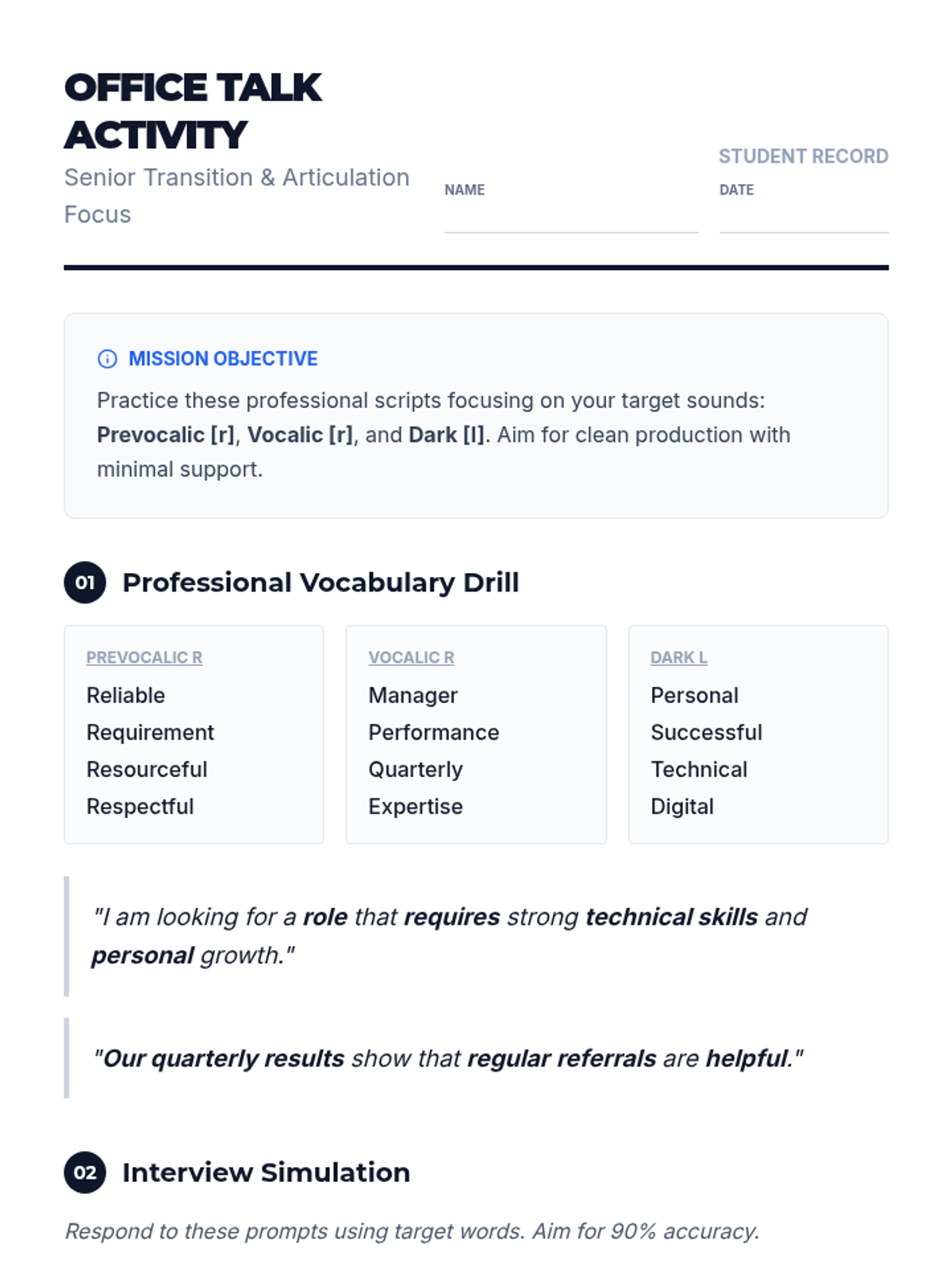 A career-readiness articulation worksheet for high school seniors. Focuses on 'r' and 'dark l' through professional vocabulary, sentence drills, and mock interview questions with spaces for self-reflection and SLP data tracking.