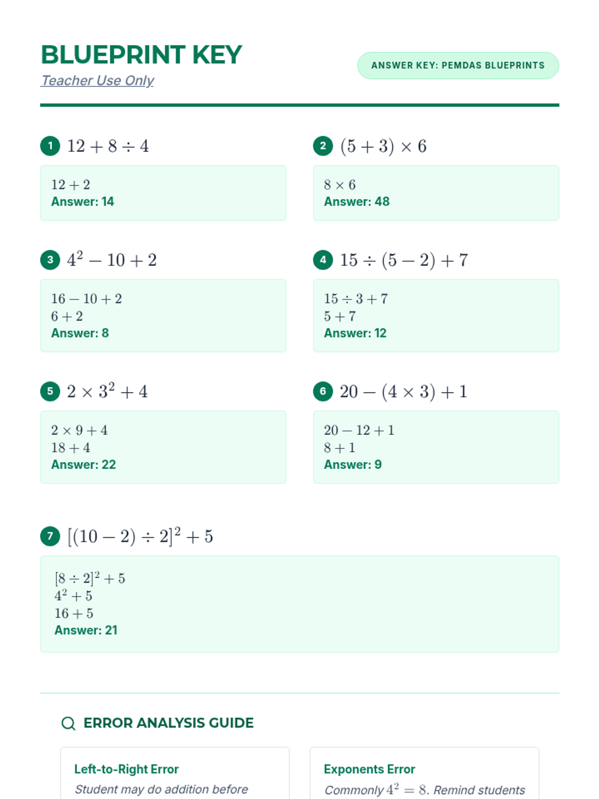 A teacher-facing answer key for the PEMDAS Blueprints worksheet, providing step-by-step solutions and a guide for common student errors.