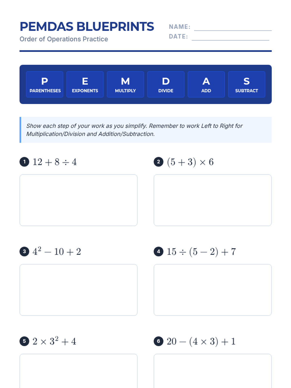 A practice worksheet for students to apply PEMDAS rules to increasingly complex expressions, featuring a clear reference header and dedicated workspaces for showing steps.