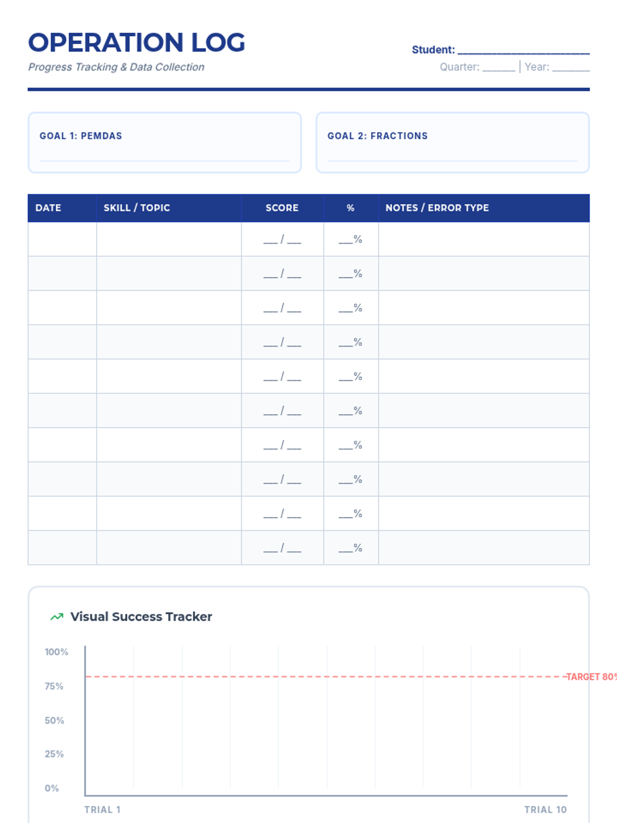 A progress tracker for monitoring student performance on IEP math goals, featuring a data collection table and a visual success chart for graphing accuracy over time.