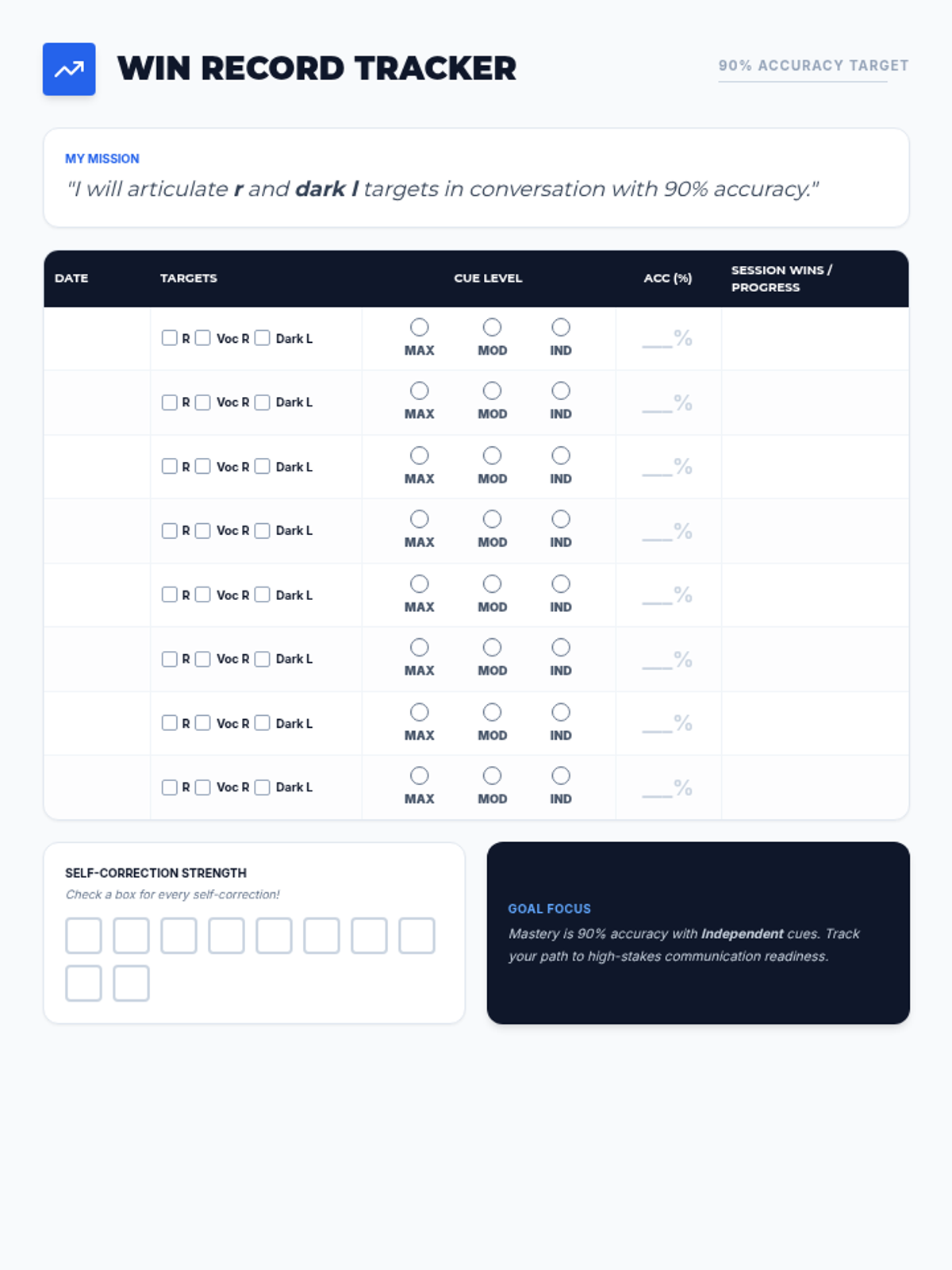 A sophisticated data-tracking log for high school seniors to monitor their articulation goals. Includes a session log for accuracy and cueing levels, as well as a self-monitoring section to track error correction.