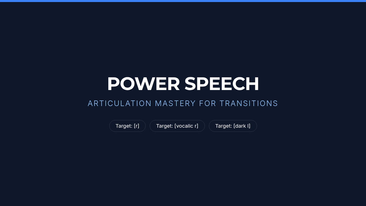 A professional 16:9 slide presentation for high school seniors focusing on articulating 'r' and 'dark l' in career-oriented contexts like interviews and workplace communication. Includes visual cues, word lists, and complex sentence challenges.