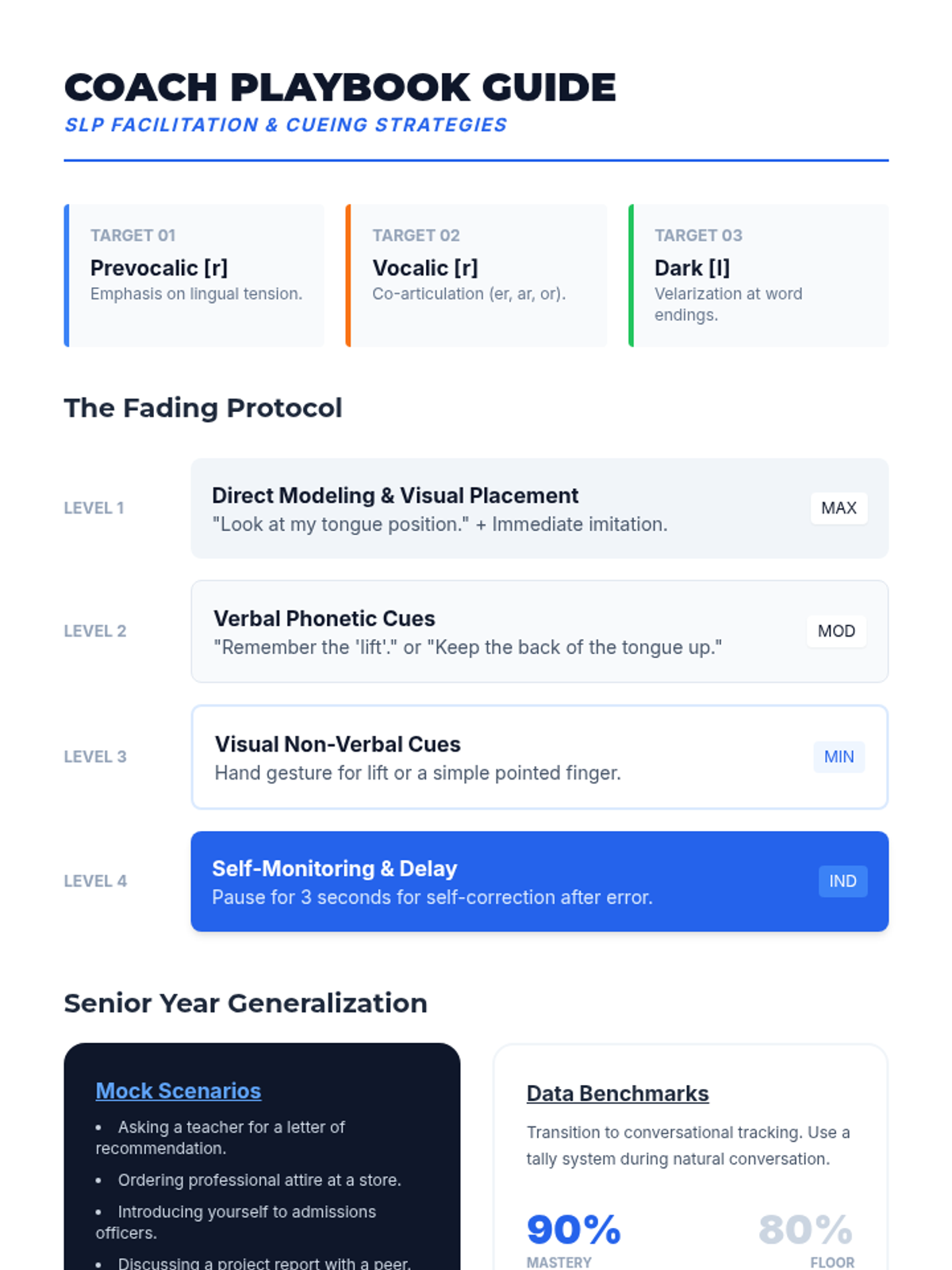 A teacher/SLP facilitation guide for working on articulation with high school seniors. It details a cueing hierarchy (fading support), professional generalization scenarios, and data-tracking benchmarks to reach the 90% accuracy goal.