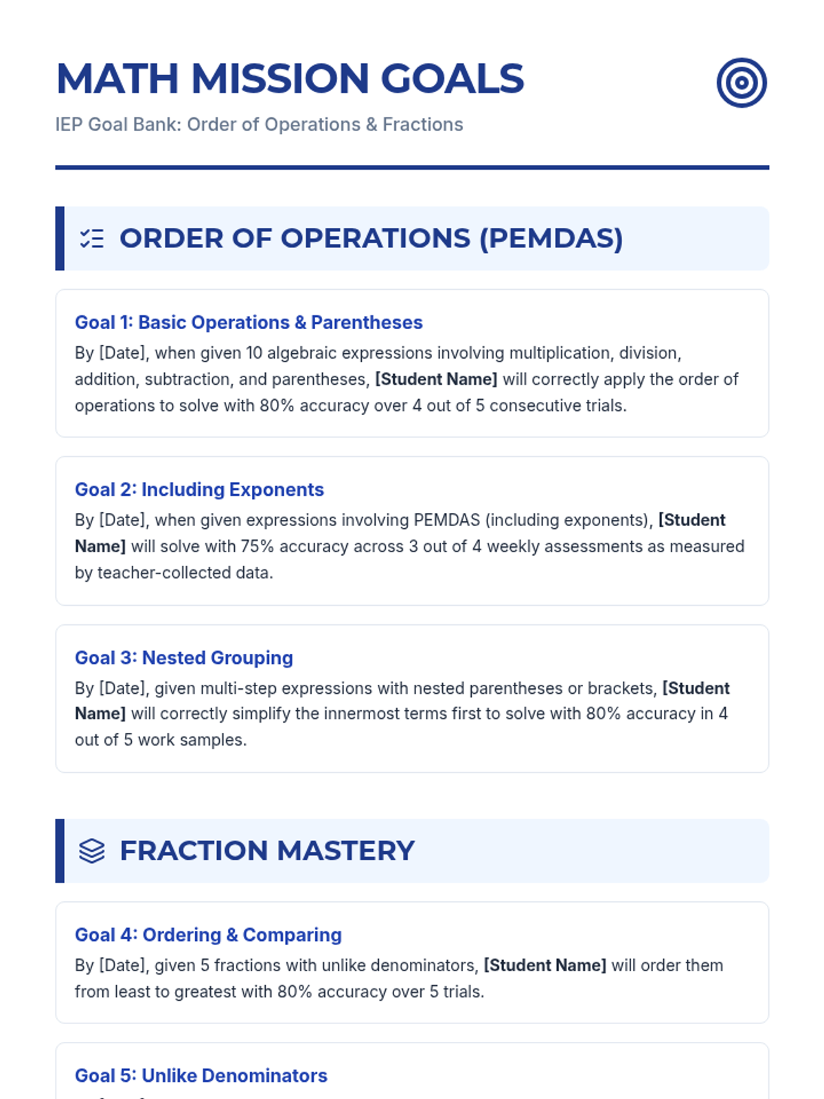 A comprehensive IEP goal bank for teachers, featuring specific, measurable goals for Order of Operations and fraction mastery, complete with instructional strategies.