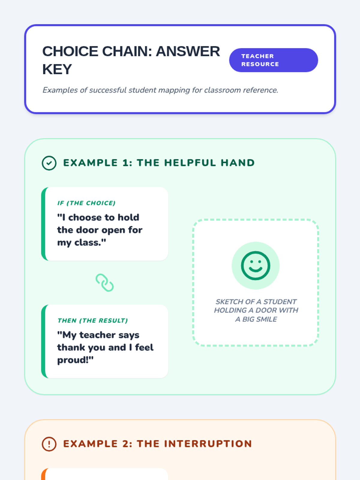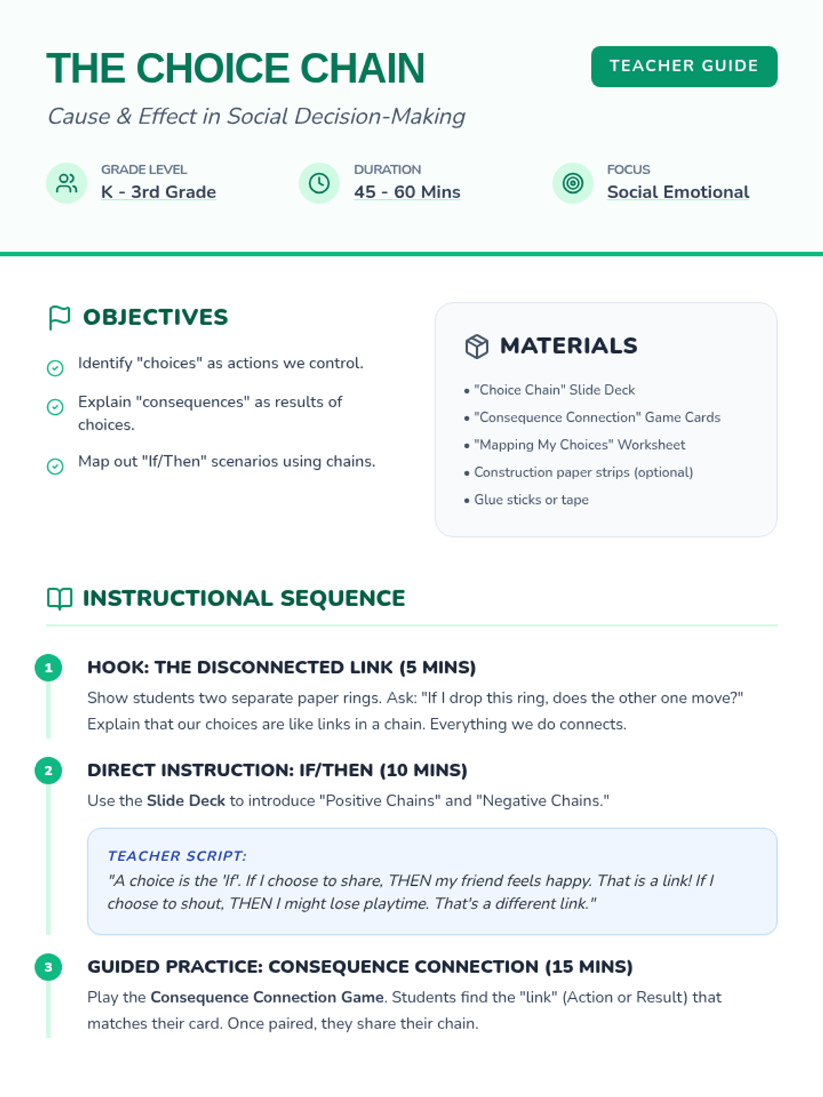A comprehensive lesson plan for teaching the "Choice Chain" concept to K-3 students. Includes instructional sequences, teacher scripts, and differentiation strategies for varied age groups. Revised to fix page breaks and improve visual hierarchy. Content tightened to fit on two pages.