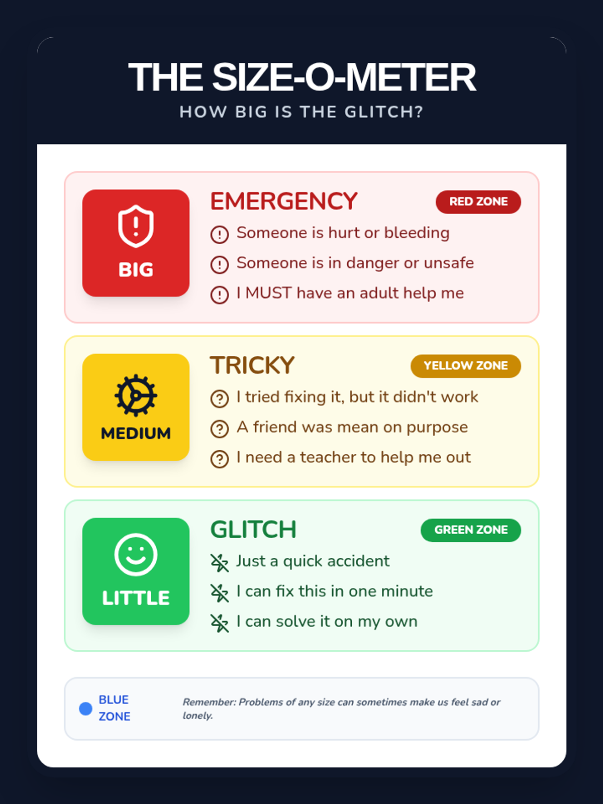 A large-format visual anchor chart (The Size-O-Meter) that categorizes problems into Big, Medium, and Little, providing clear criteria for each.
