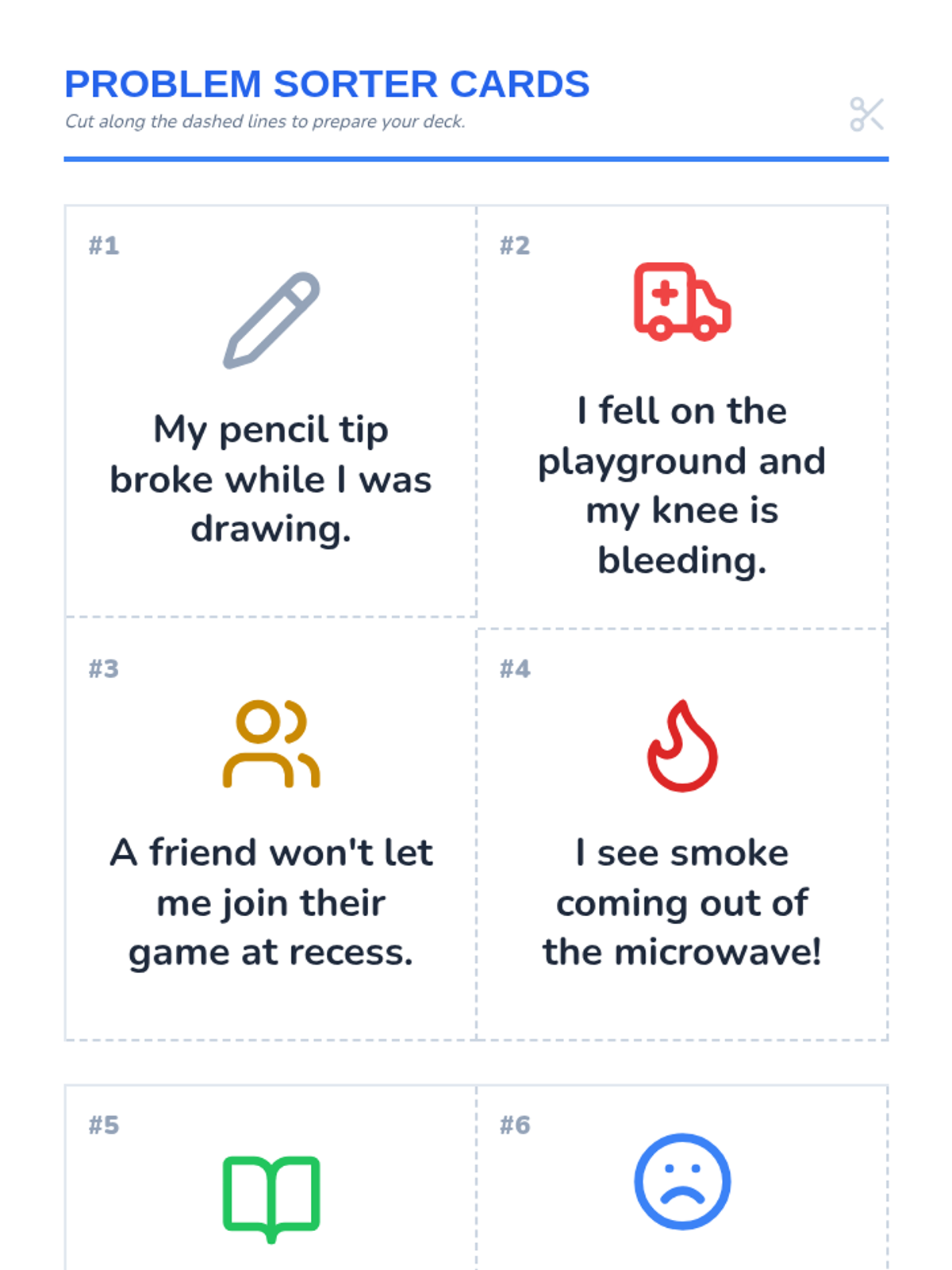 Scenario cards featuring 10 diverse problems for students to sort and use during the 'Statue or Scurry' movement game. Includes 'Create Your Own' blank cards.