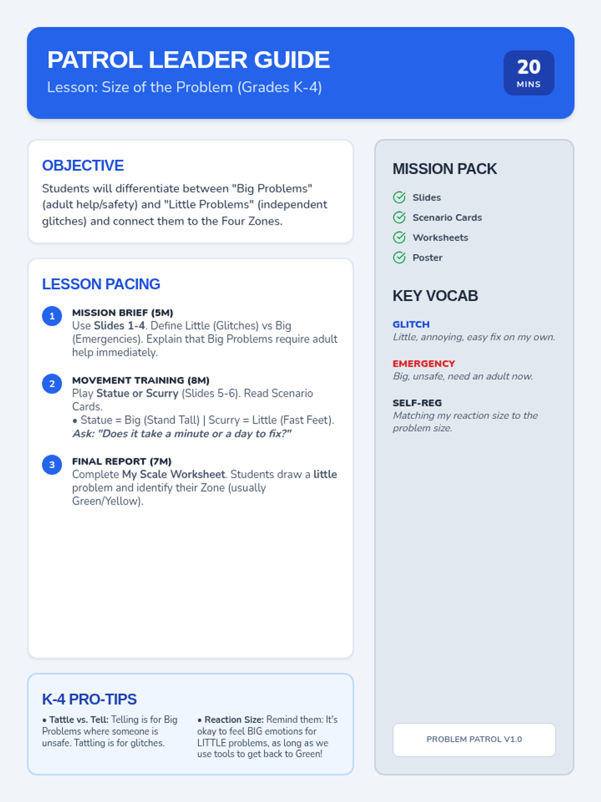 A comprehensive teacher guide for leading the 20-minute 'Problem Patrol' lesson, now featuring 'Reaction Matching' and updated pacing for the new activity.