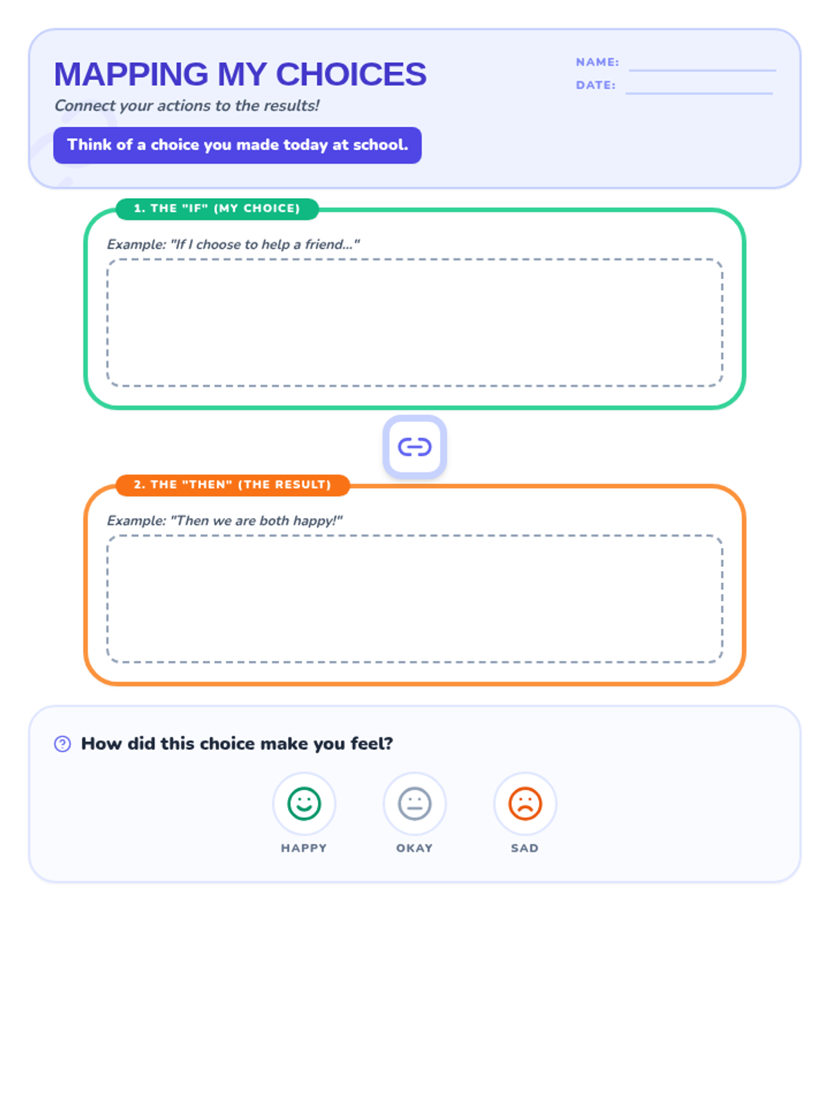 A student-facing worksheet for mapping "If/Then" scenarios. Features large work areas for drawing and writing. Revised to ensure all content fits on a single page, improve example contrast, and enhance icon visibility. Background set to white for printer-friendliness.