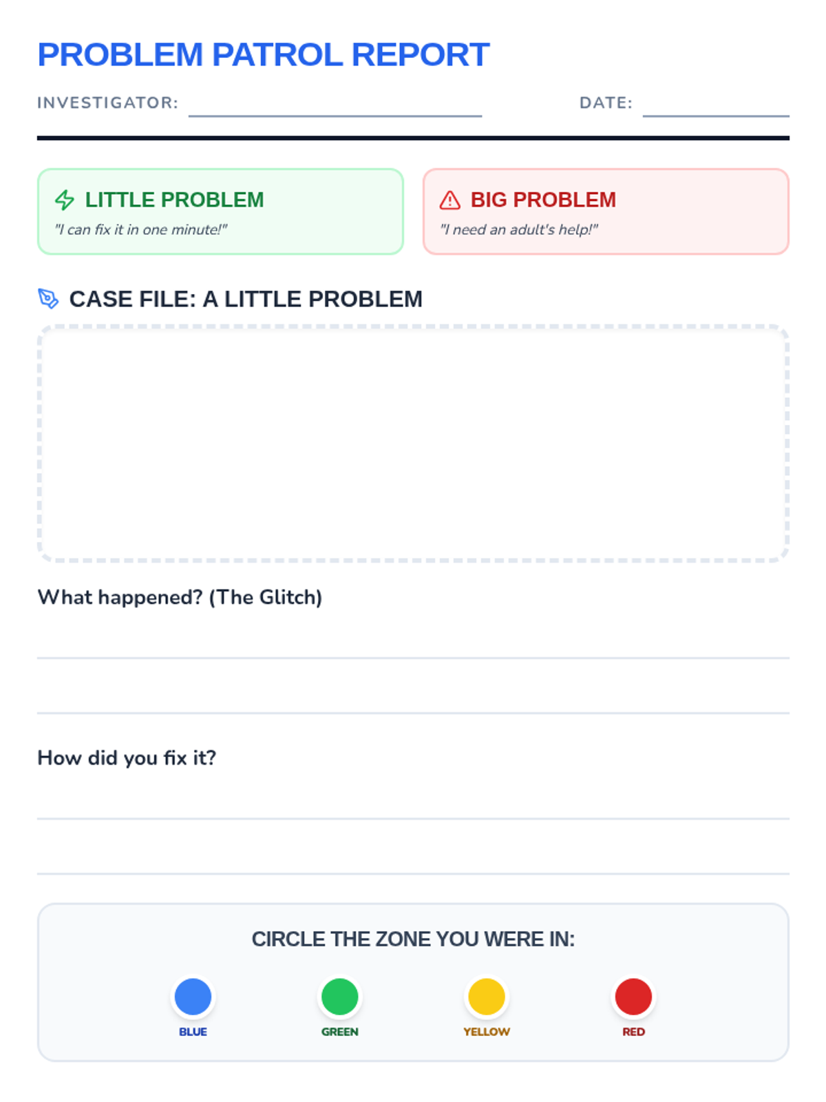 A student reflection worksheet where children identify a personal 'little problem', draw it, and connect it to their emotional state within the Four Zones of Regulation.