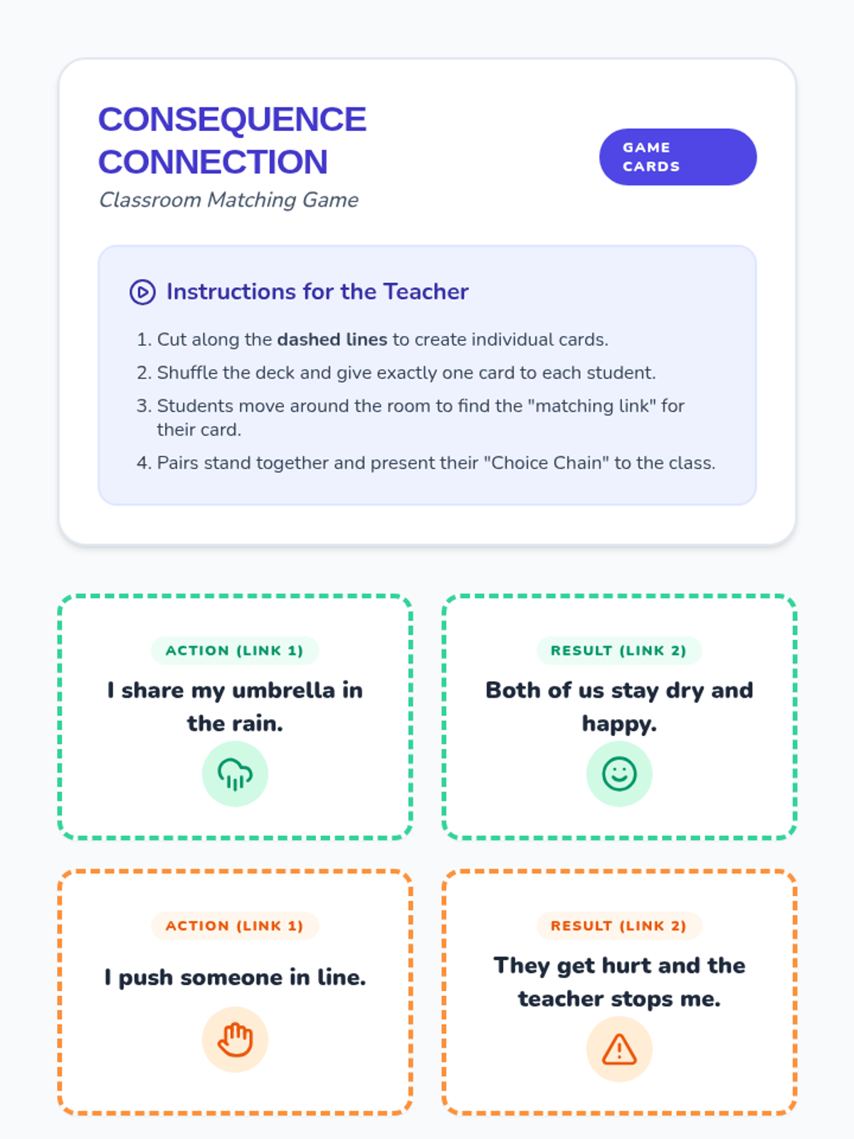 A set of printable "Action" and "Result" cards for a classroom matching game. Revised with improved page breaks, card styling, and higher-contrast text in the DIY section. Includes extra blank cards to fill the layout.