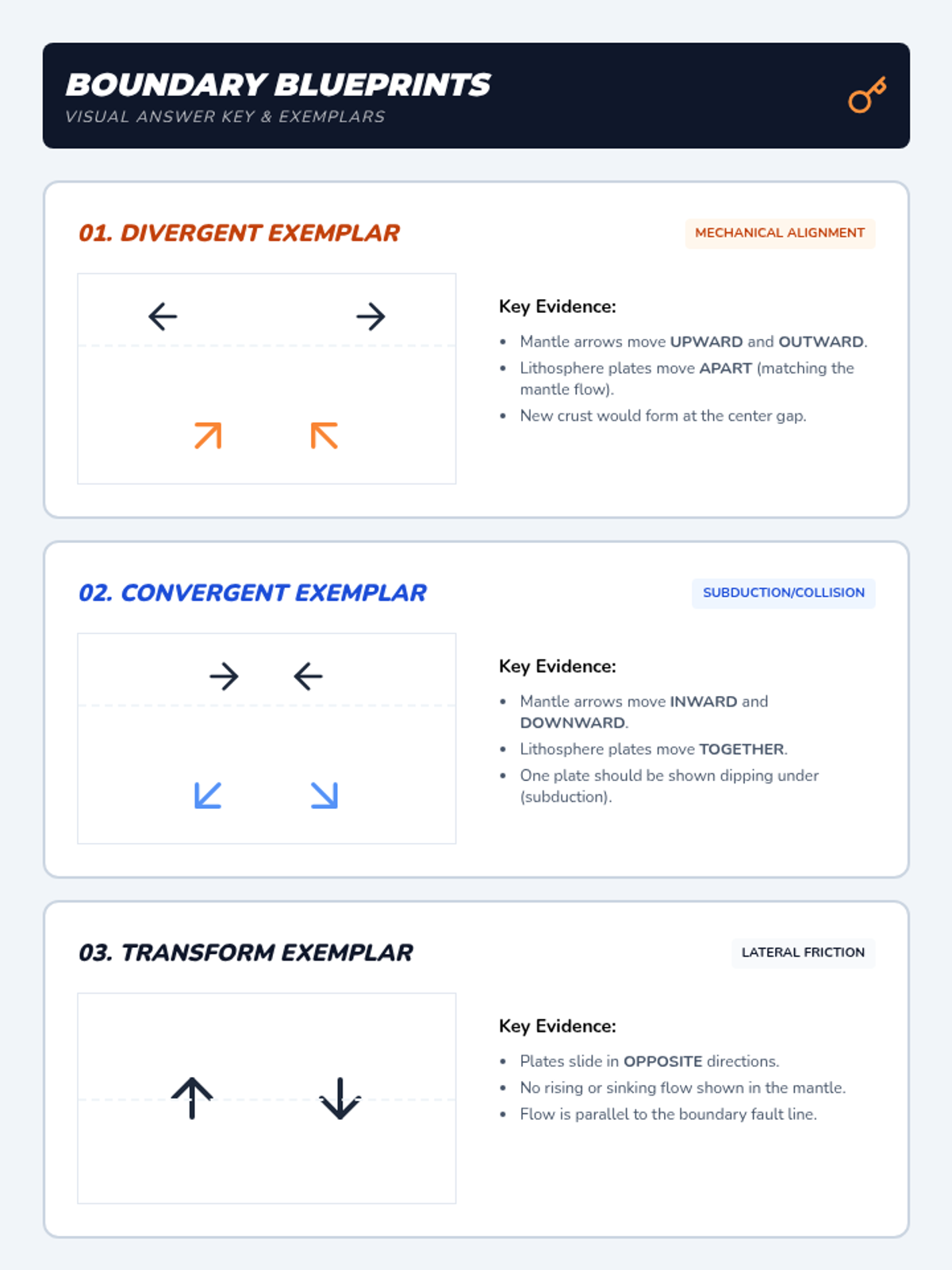 Answer key for the plate boundary drawing activity, featuring visual exemplars of convection flow for divergent, convergent, and transform boundaries.