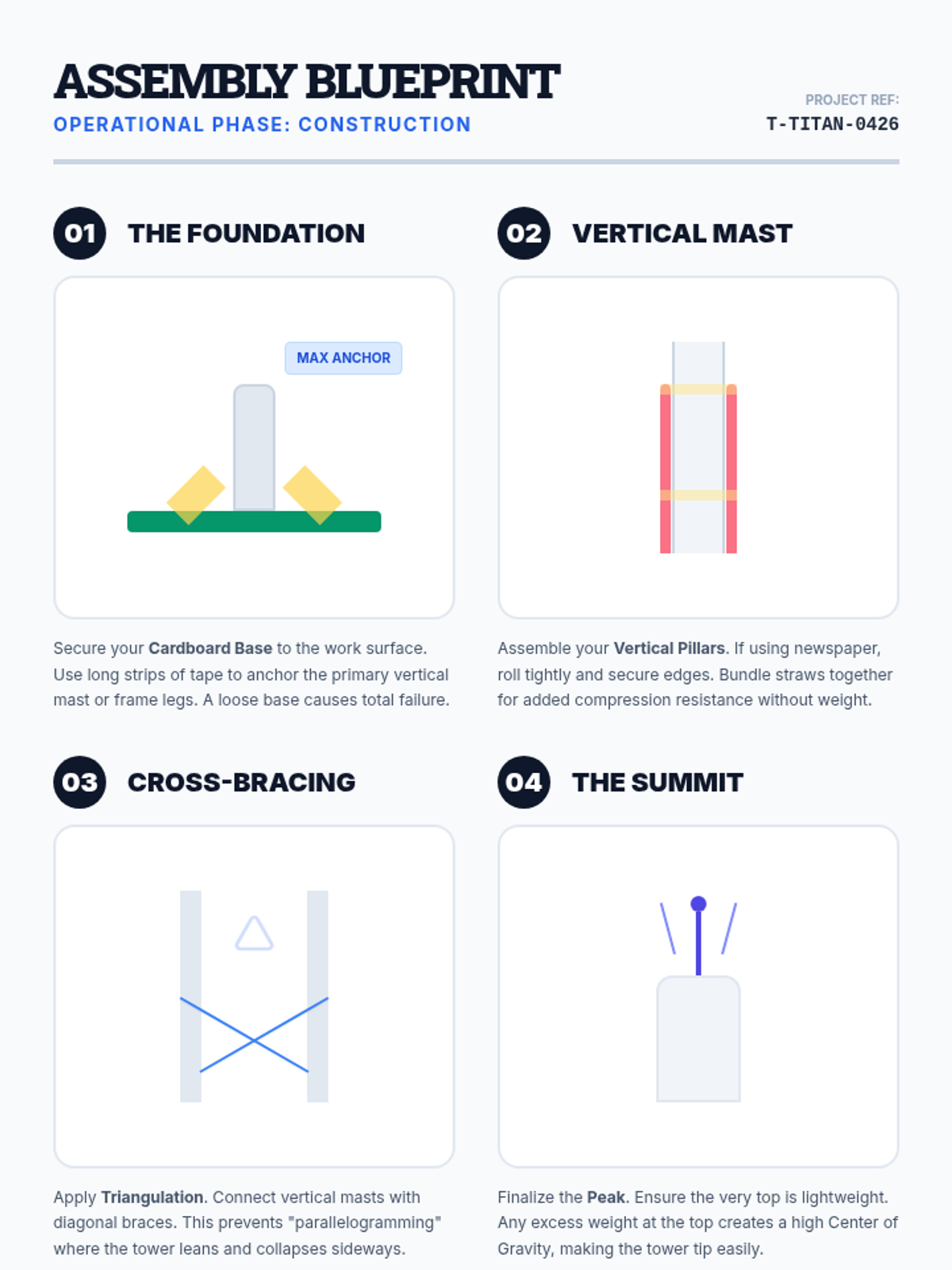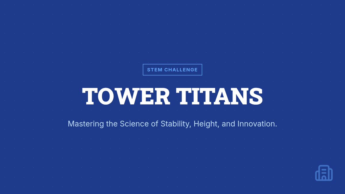 Visual presentation explaining the engineering principles, structural types (Terminal, Suspension, Stayed), and material innovation strategies for a STEM tower building challenge.