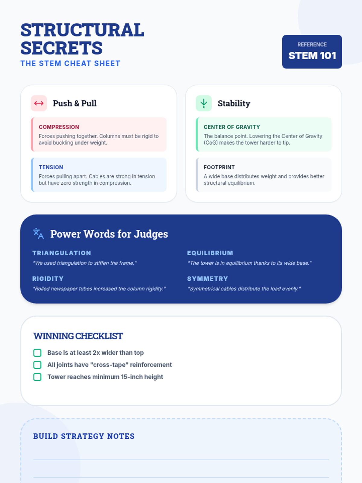 A quick-reference cheat sheet for students summarizing structural engineering concepts like tension, compression, and center of gravity, including high-impact vocabulary for their presentation.