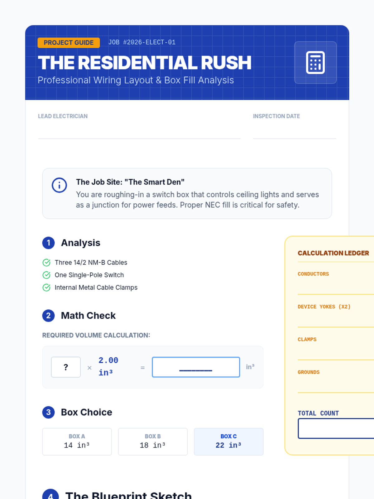 Hands-on project guide for a residential wiring scenario. Students analyze a specific box wiring requirement, perform the fill calculations, select the appropriate box from a catalog, and sketch a wiring diagram. Consolidated for 2-page printing.