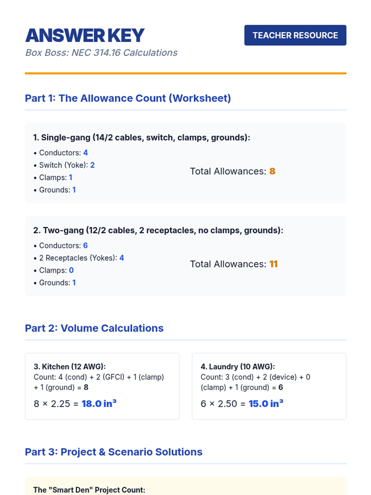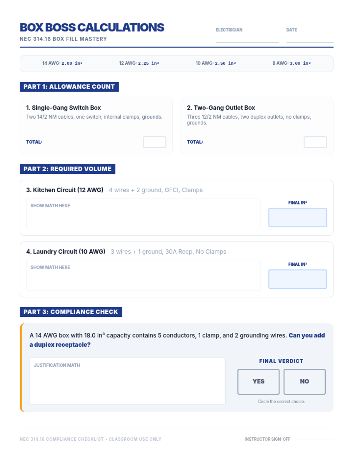 Practice worksheet for calculating NEC 314.16 box fill. Includes problems on allowance counts, volume calculations for various AWG sizes, and scenario-based critical thinking. Optimized for single-page printing.
