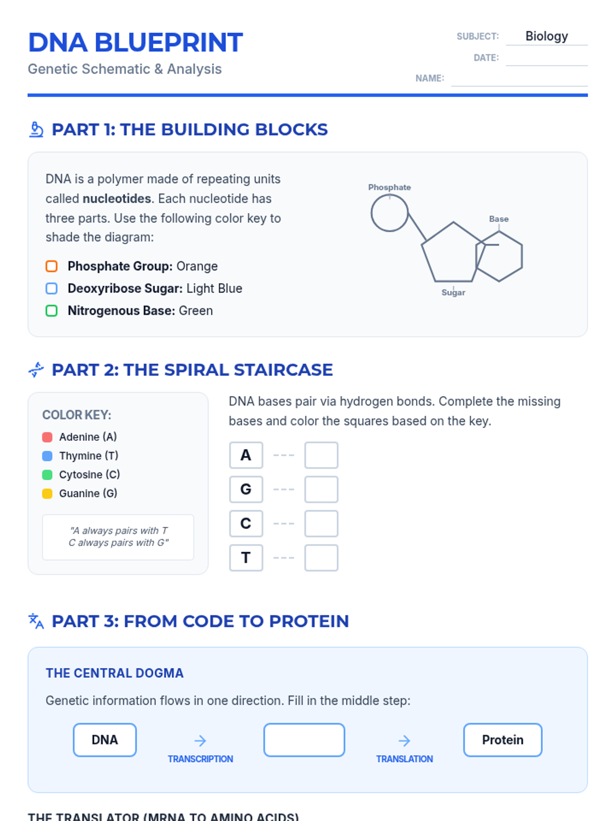A comprehensive DNA structure and translation worksheet for 10th-grade biology, featuring coloring activities for nucleotides and base pairs, plus practice with the central dogma and codons.