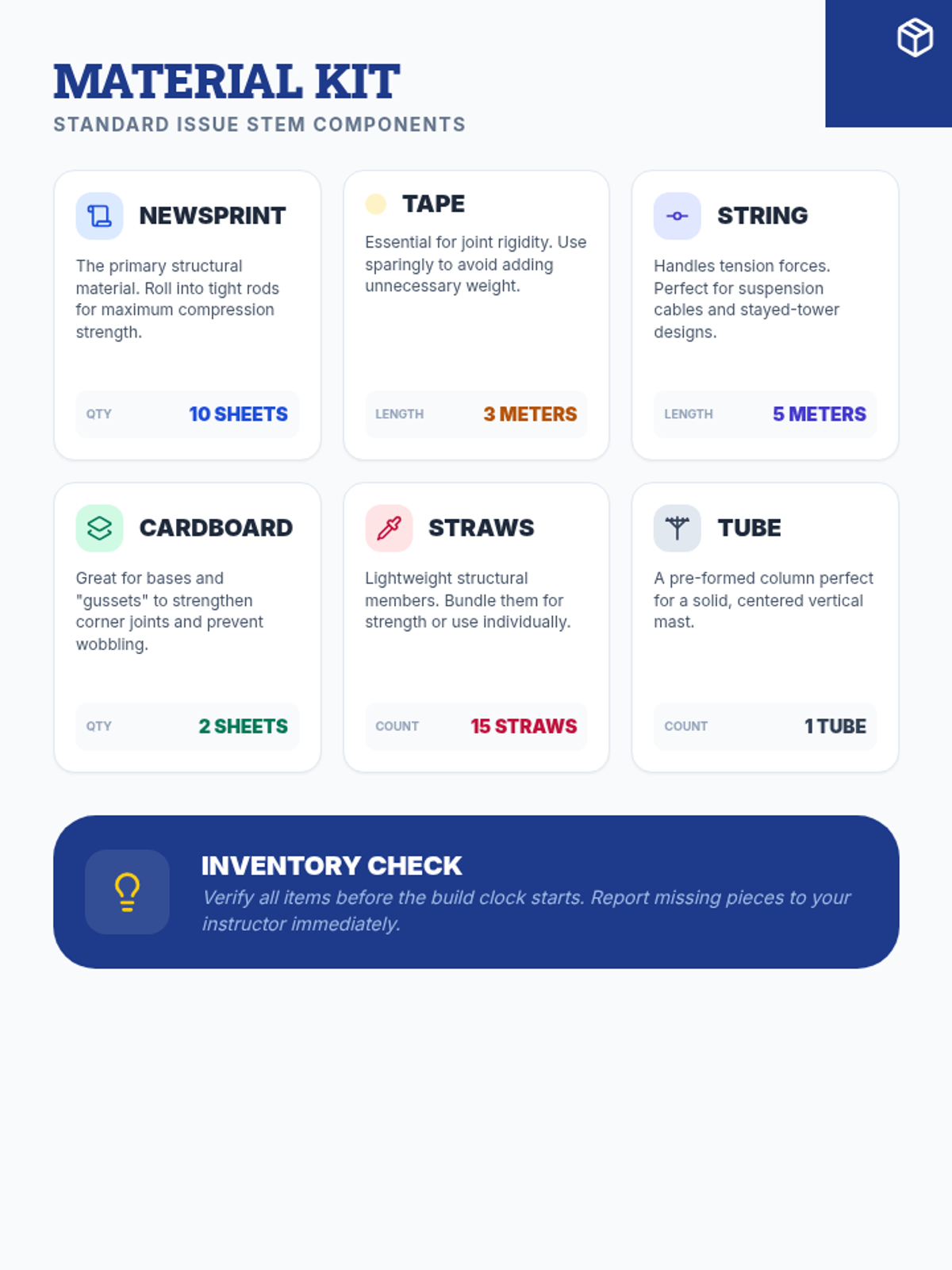 A two-page student resource guide detailing the official STEM material kit and providing a visual design gallery for the three primary tower structural types.
