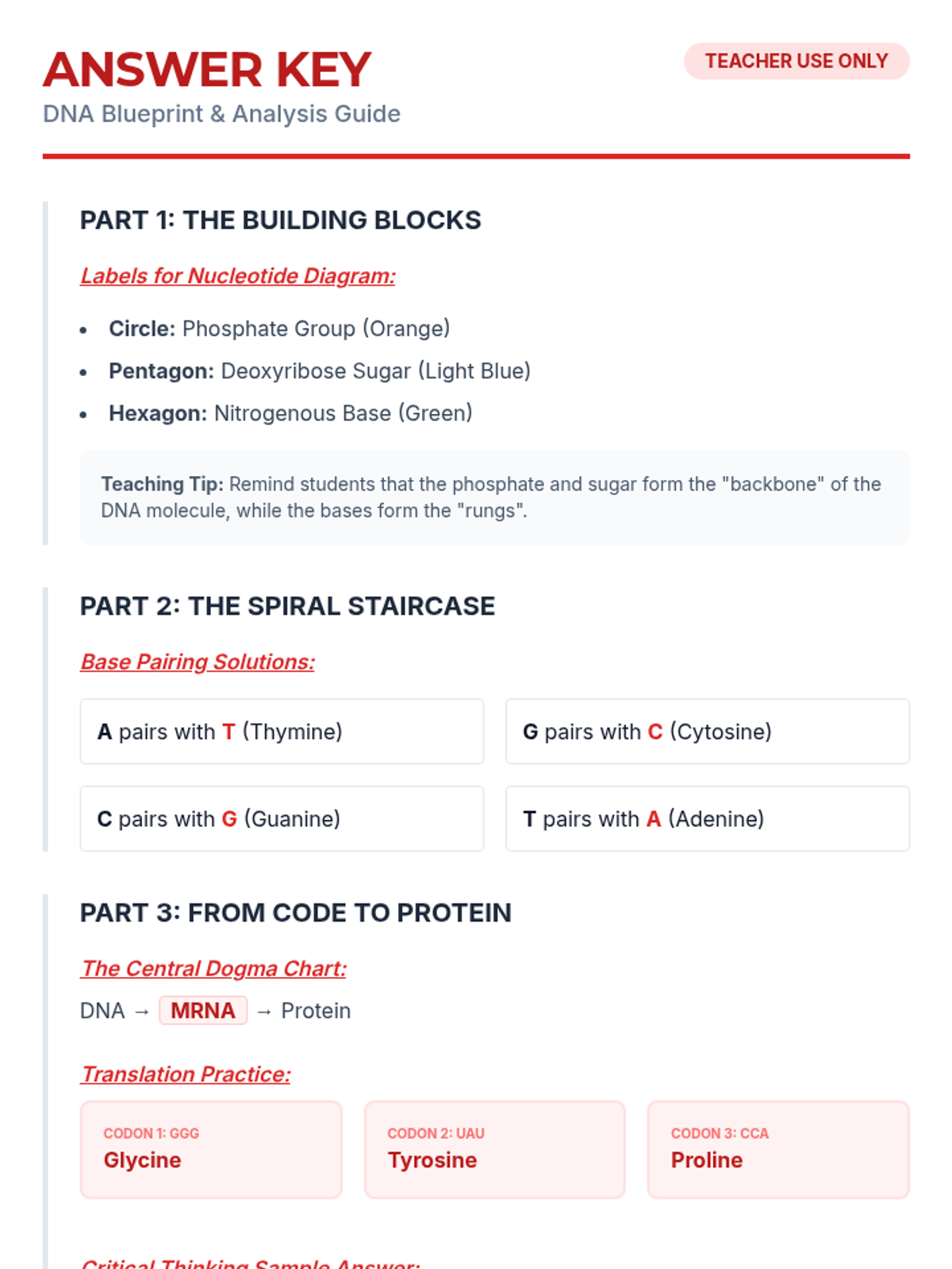 An answer key and teaching guide for the DNA Blueprint worksheet, including expected answers for base pairing, translation practice, and a sample critical thinking response.