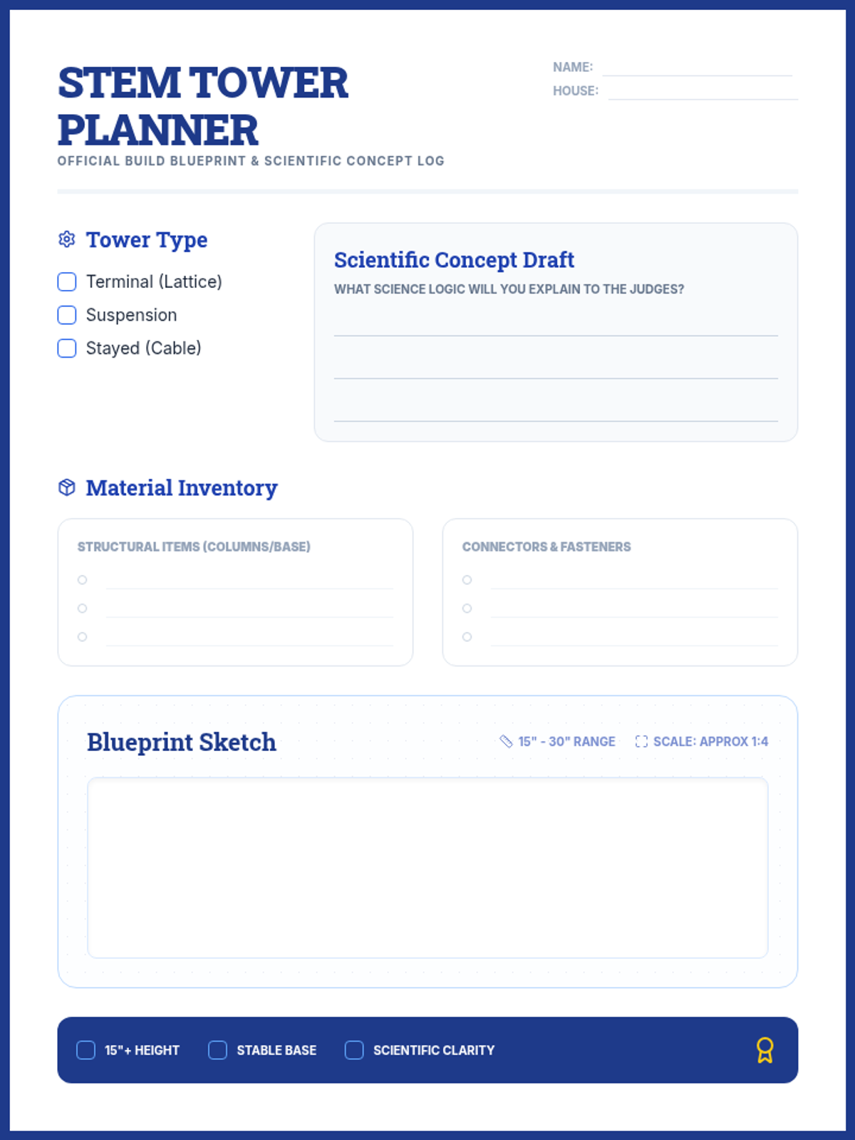 A planning worksheet for students to sketch their tower designs, inventory recycled materials, and draft their one-minute scientific presentation for the STEM challenge.