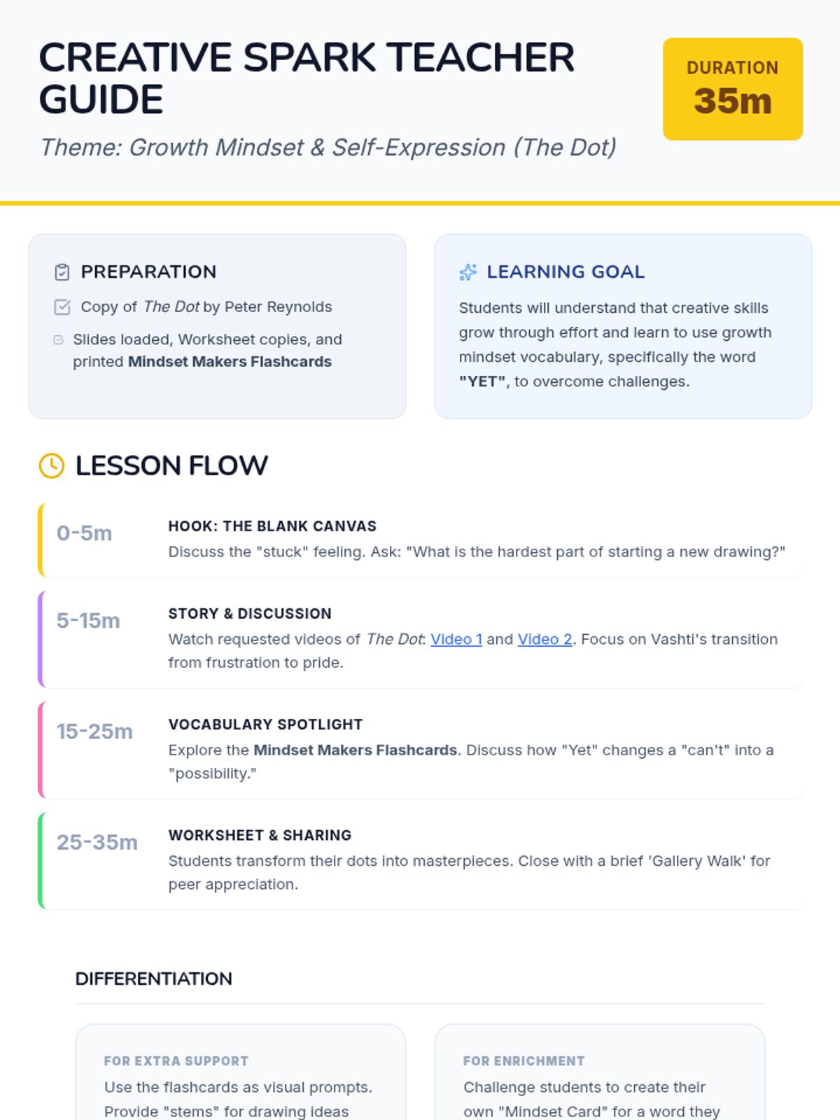 A simplified teacher guide for a 35-minute SEL lesson, focusing on discussion and creative work. Includes specific video links and polished layout for word wall and reflection sections.
