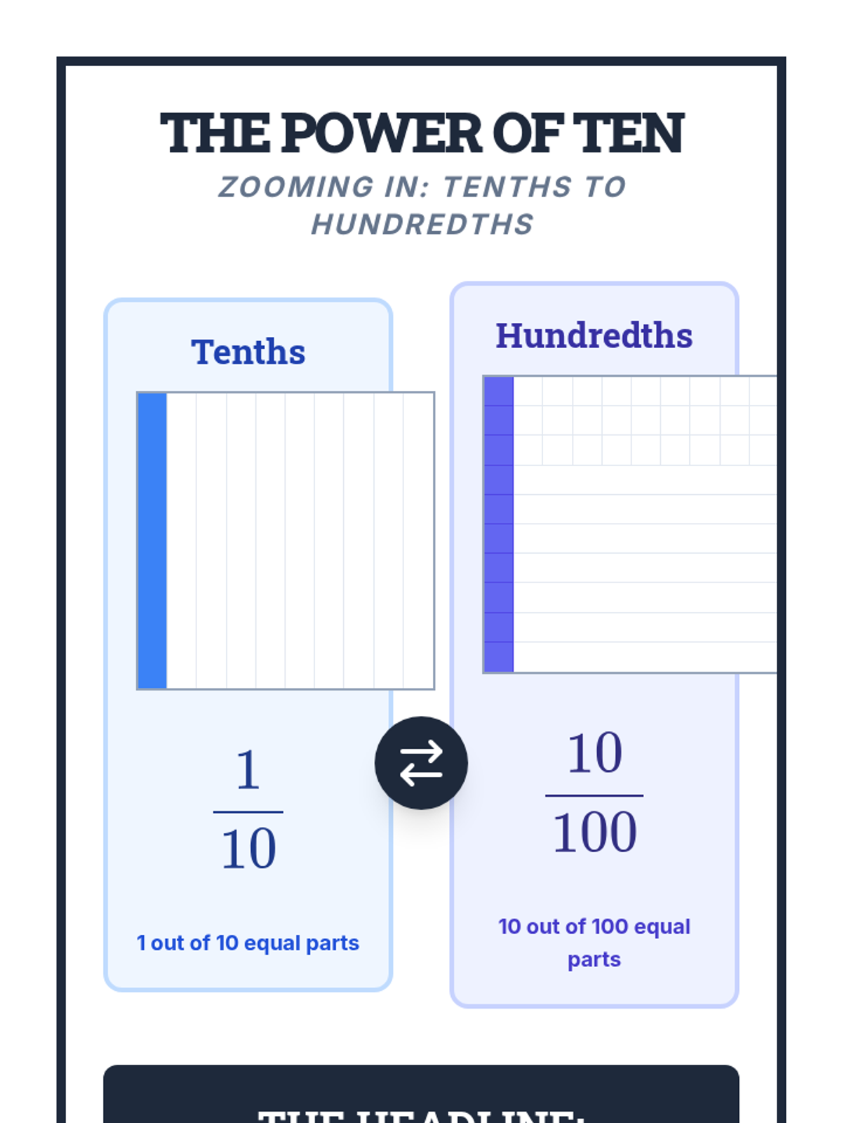 Anchor chart for Lesson 1 showing the visual equivalence of 1/10 and 10/100 using grid models. Features a clear side-by-side comparison and the numerical rule for equivalence.