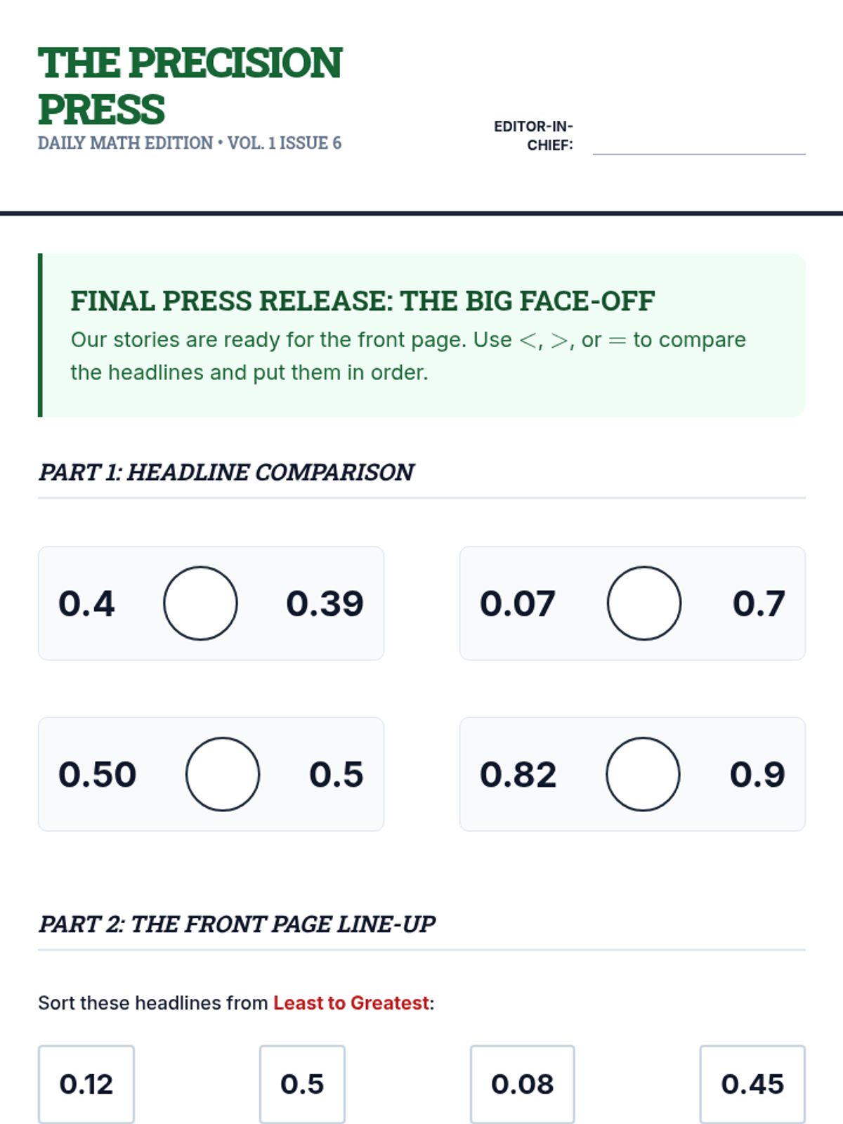 Student practice worksheet for Lesson 6. Focuses on comparing decimals using inequality symbols and ordering them from least to greatest. Includes a justification task.