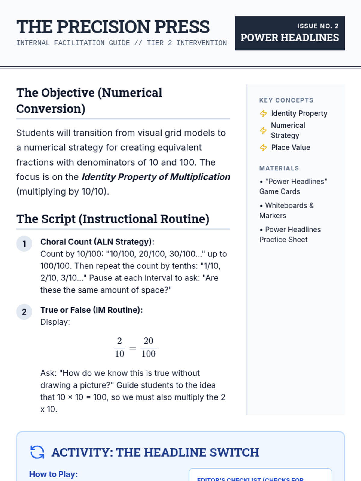Teacher facilitation guide for Lesson 2, focusing on the numerical conversion of tenths to hundredths using multiplication. Includes a choral counting routine and the 'Headline Switch' activity.