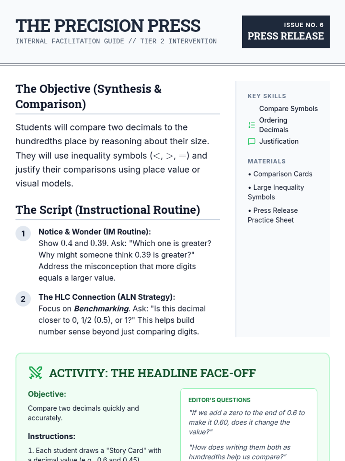 Teacher facilitation guide for Lesson 6, focusing on comparing decimal fractions. Includes a 'Notice and Wonder' routine and the 'Headline Face-Off' activity.