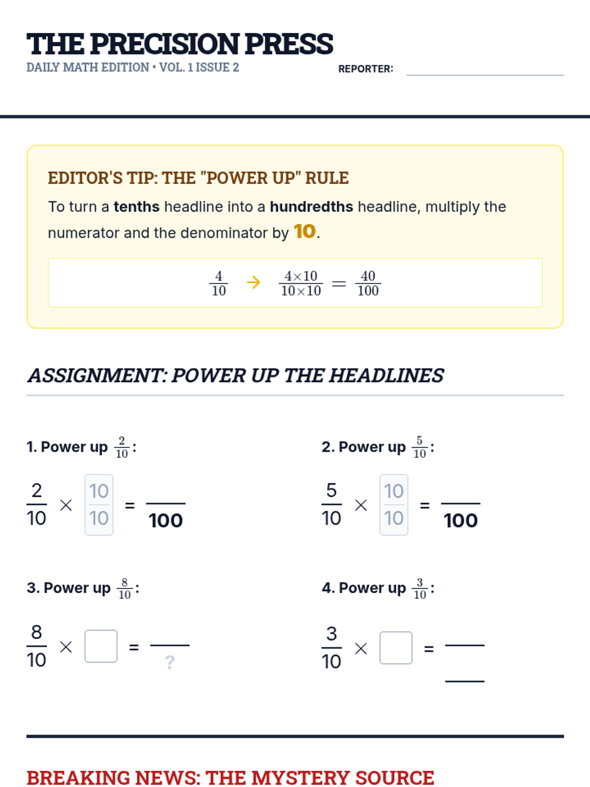 Student practice worksheet for Lesson 2. Focuses on the numerical conversion strategy of multiplying the numerator and denominator by 10 to express tenths as hundredths.