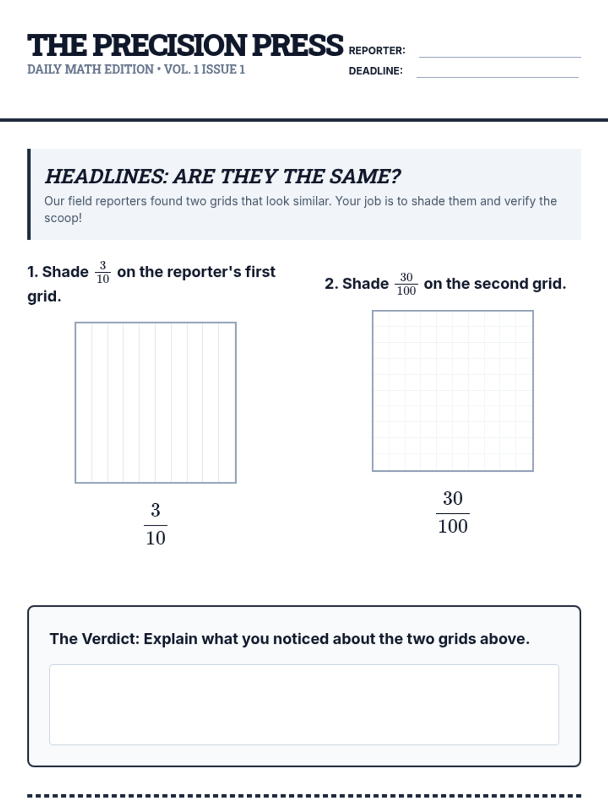 Student practice worksheet for Lesson 1. Includes visual shading problems on 10x10 grids to compare tenths and hundredths, along with numerical equivalence problems and a challenge question.