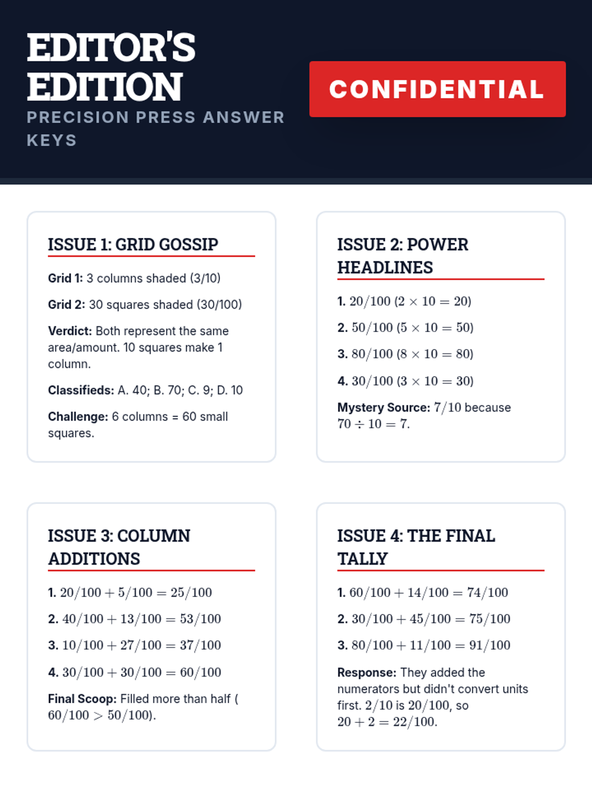 Comprehensive answer key for all six lessons in the Precision Press intervention series. Provides specific solutions for every visual, numerical, and justification problem.