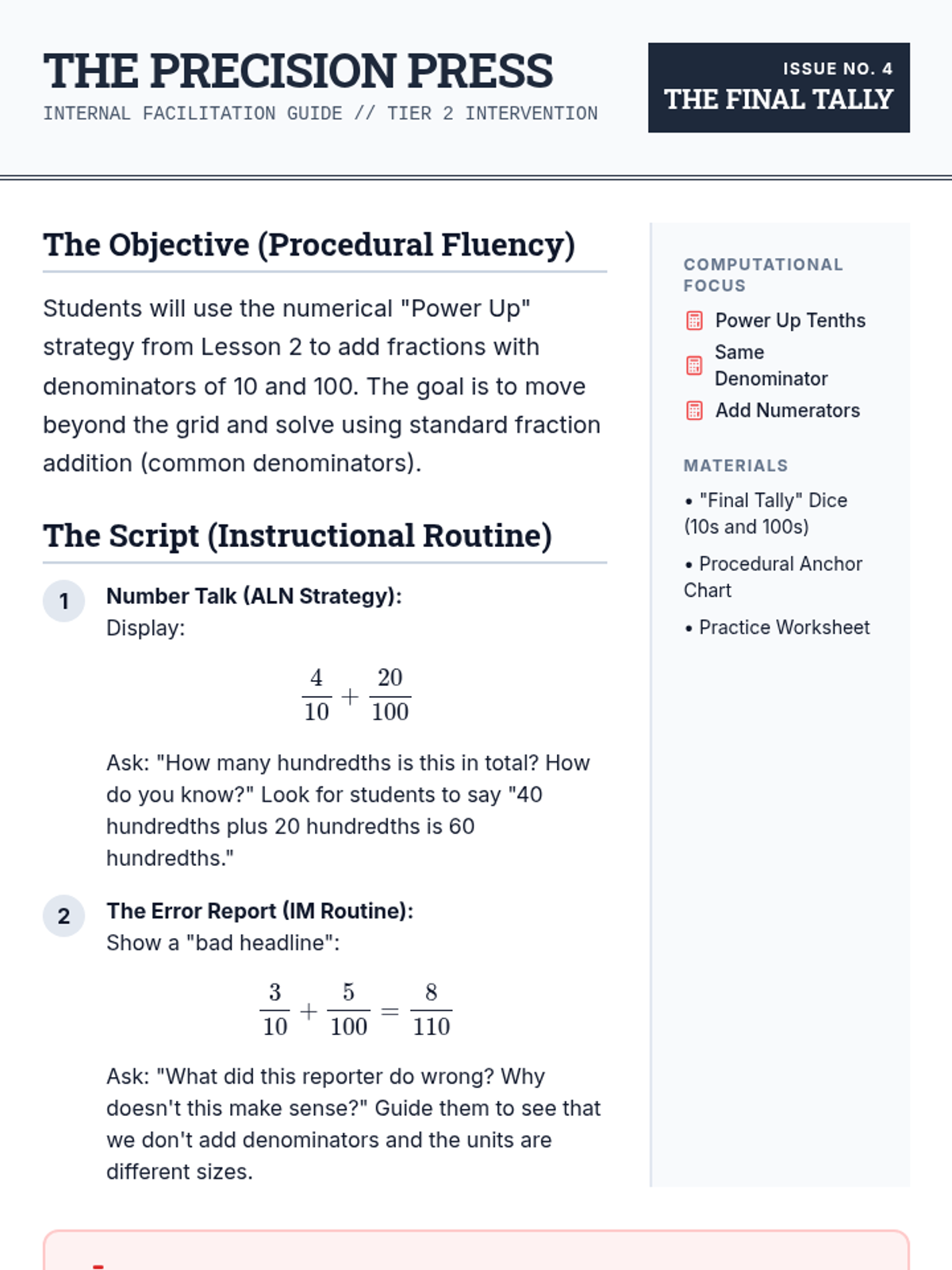 Teacher facilitation guide for Lesson 4, focusing on the procedural addition of tenths and hundredths. Includes a number talk routine and the 'Press Deadline' activity.