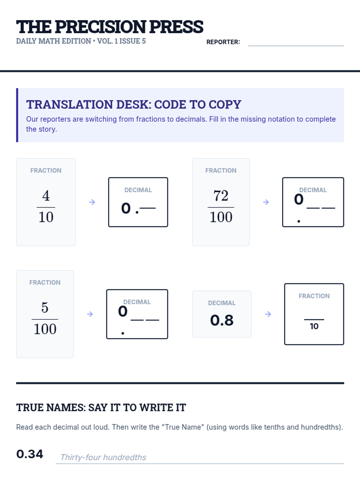 Student practice worksheet for Lesson 5. Focuses on converting between fraction and decimal notation for tenths and hundredths, including writing word names and correcting notation errors.