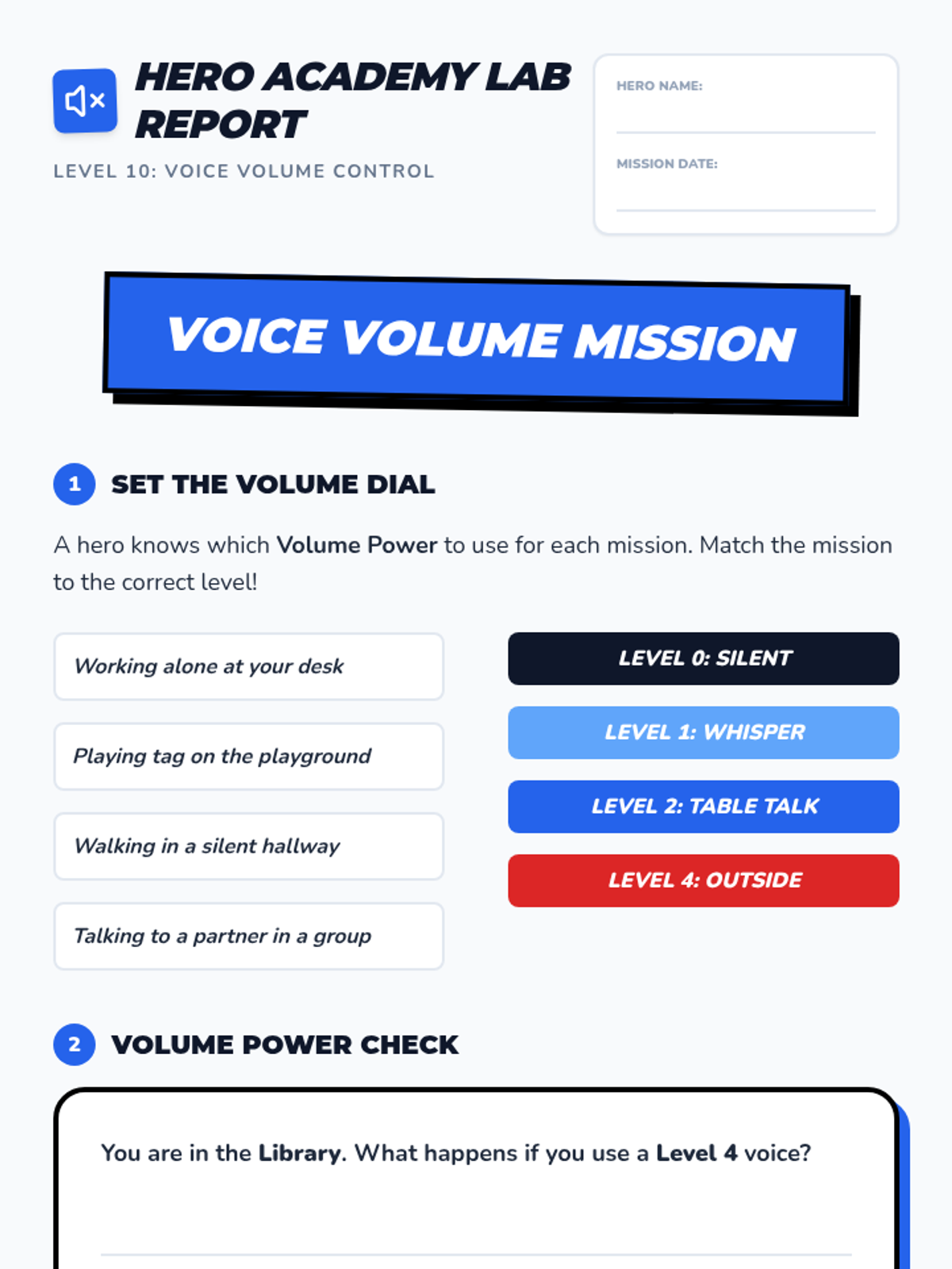 A worksheet for Lesson 10 focusing on mastering different voice volume levels. Students match school activities to the appropriate volume level and reflect on the consequences of using an incorrect volume in specific settings.