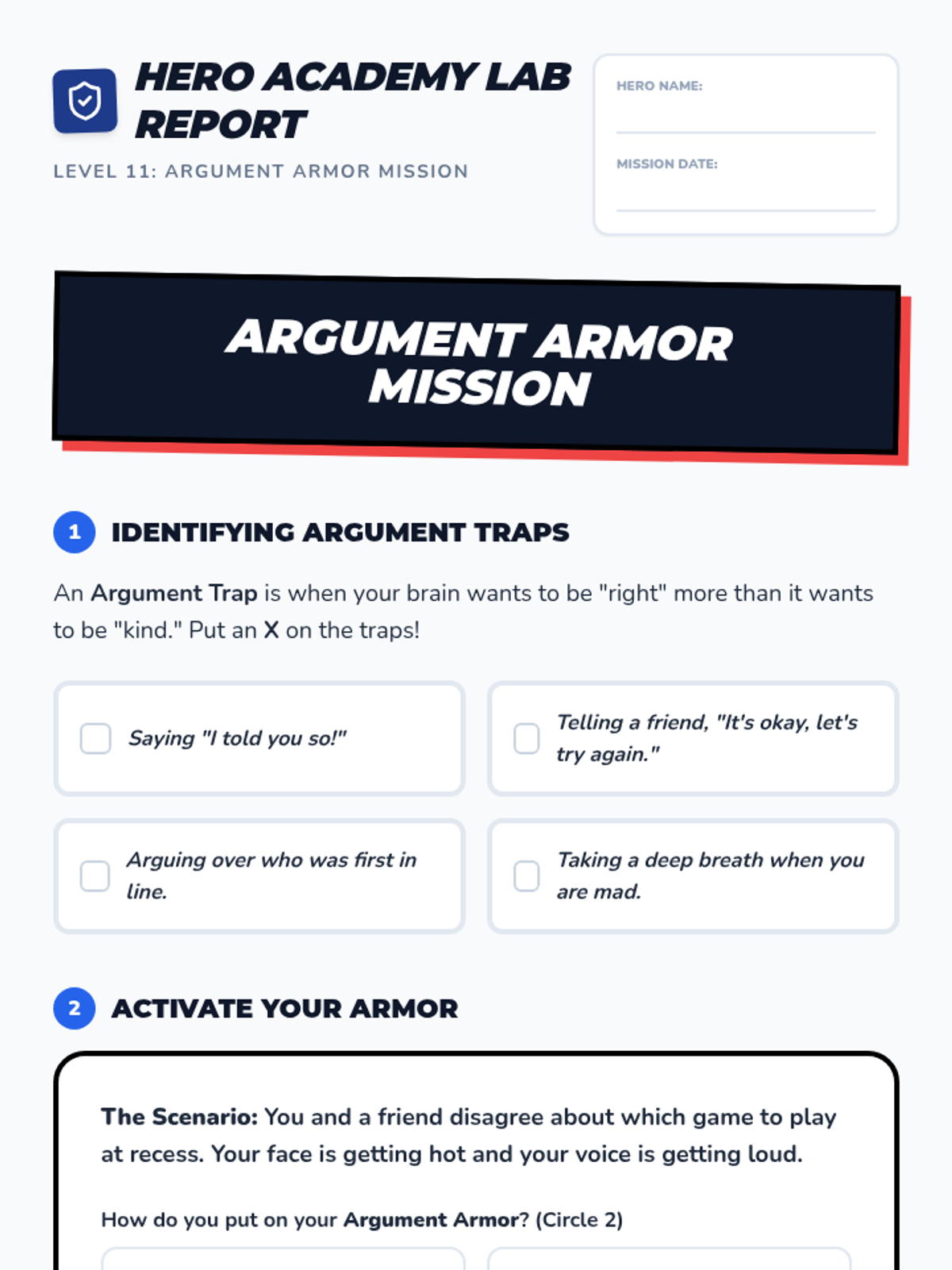 A worksheet for Lesson 11 focusing on conflict resolution. Students identify 'Argument Traps', select de-escalation strategies, and practice using 'Cool Down' phrases to maintain positive social interactions.