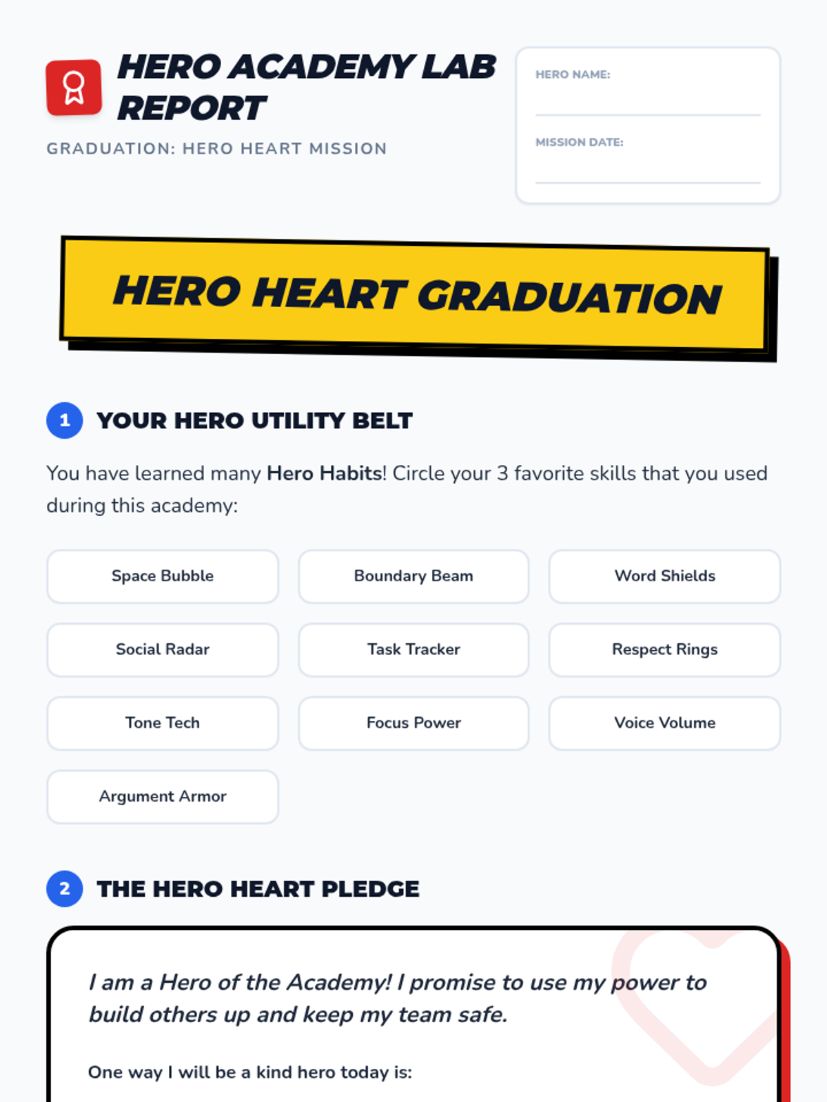A final reflection worksheet for the Hero Heart Graduation. Students review their favorite skills, make a "Hero Heart Pledge" to be kind and respectful, and draw their graduation portrait.