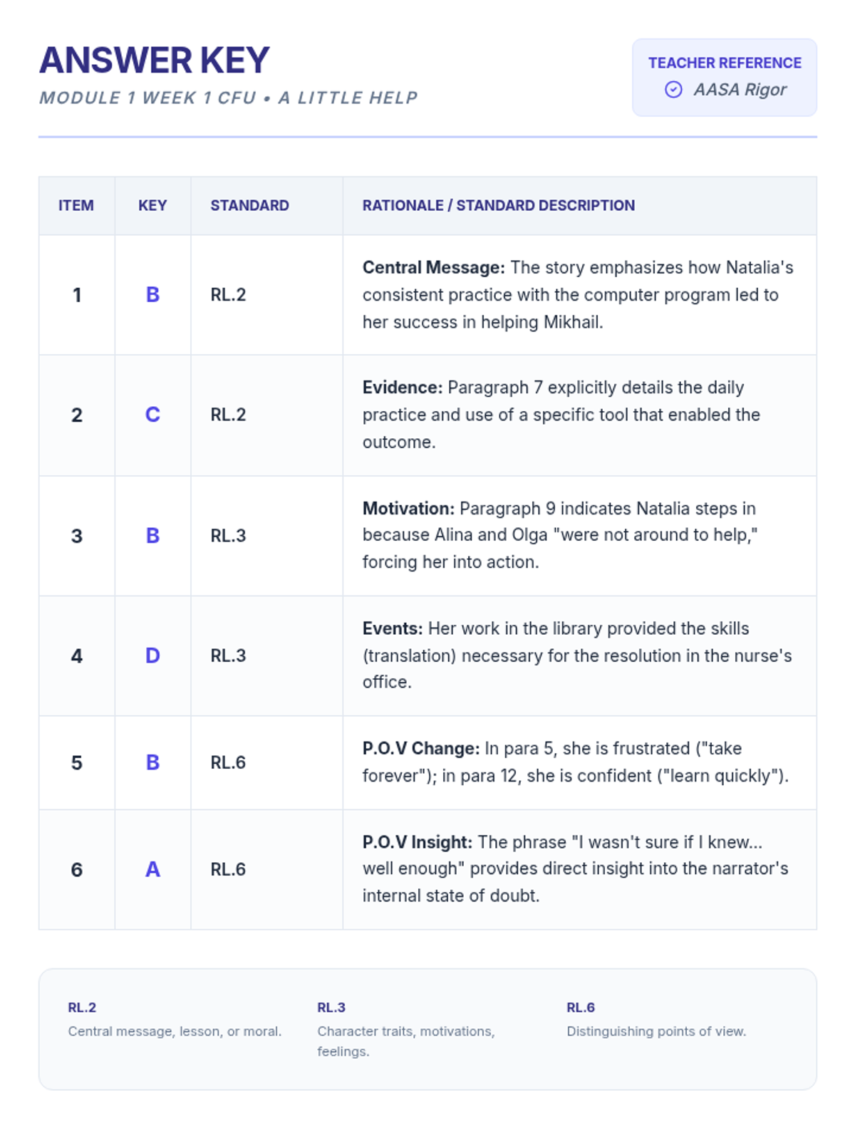 A comprehensive teacher answer key for the Language Learner Check worksheet. It includes correct answers, standard alignments for RL.2, RL.3, and RL.6, and brief rationales for each item to support instructional feedback.