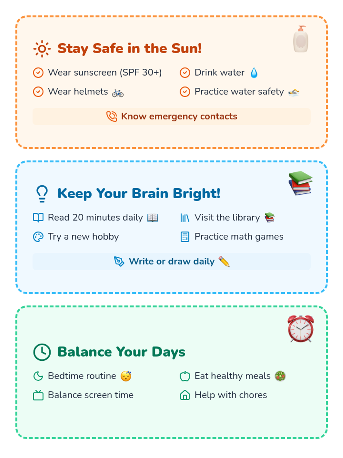 Six visually distinct cards containing summer tips for students and parents. Refined layout with centered full-width items and improved visual balance.