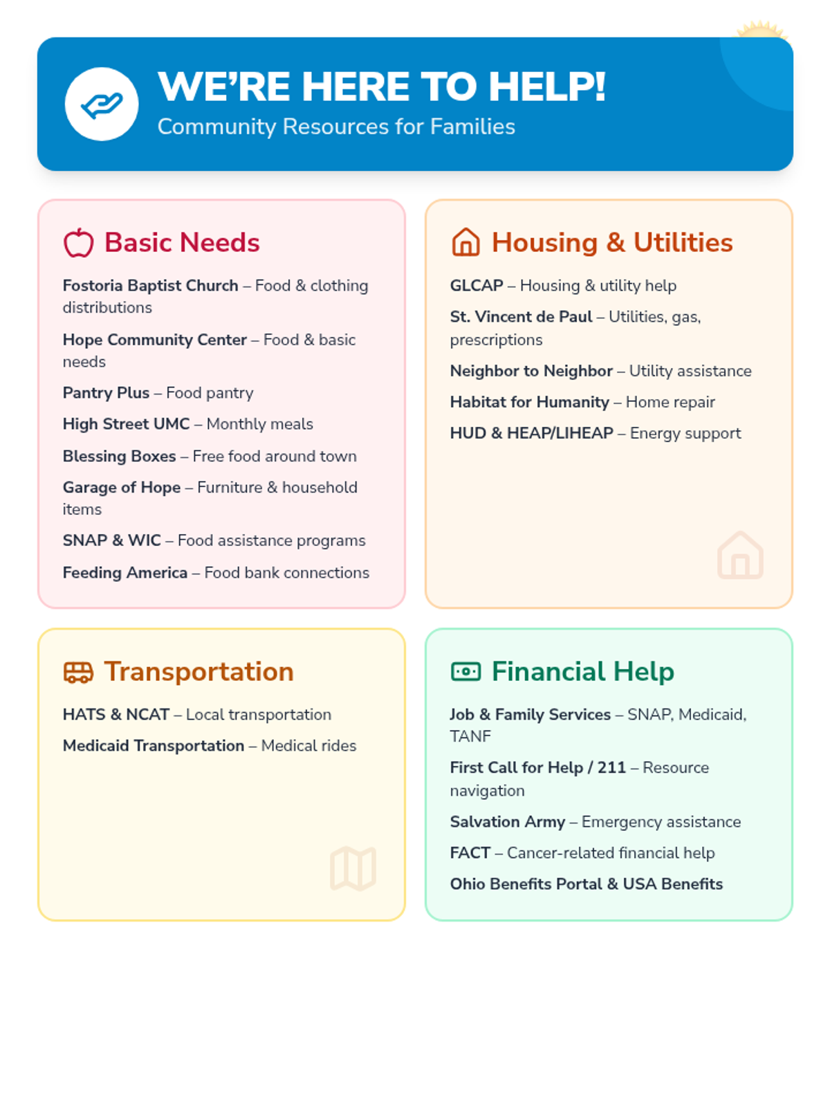 Organized, easy-to-read cards for local Fostoria community resources including food support, housing, utilities, and health services.