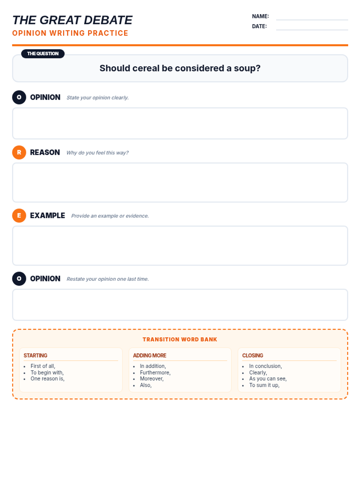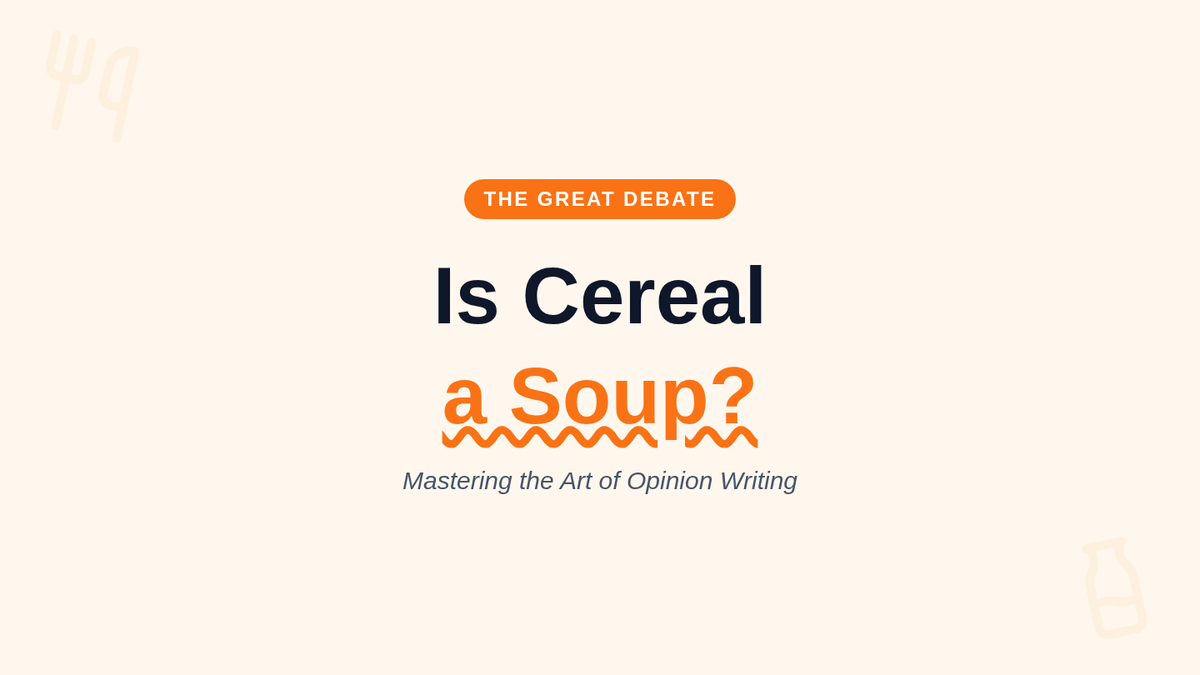 An interactive slide presentation teaching the OREO method of opinion writing using the 'Is cereal a soup?' debate. Includes clear definitions, transition word banks, and examples.