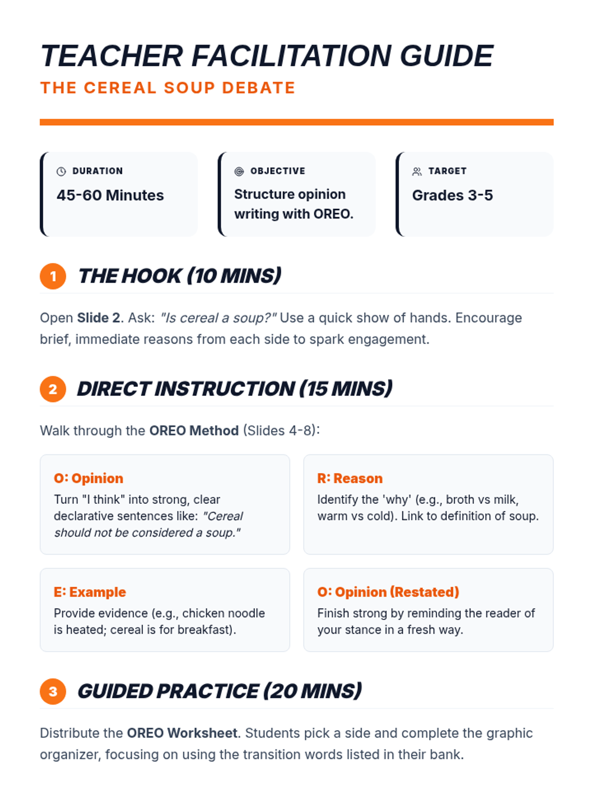 A comprehensive teacher's guide for facilitating the cereal soup debate lesson. Revised to include the requested transition words and fixed page break issues.