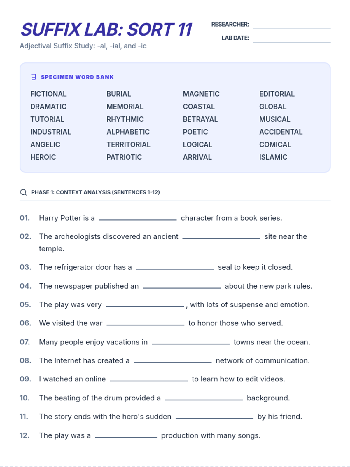 A 3-page printable packet for Sort 11 (-al, -ial, -ic). Includes 24 fill-in-the-blank sentences across two pages, followed by a logic page with 6 word unscrambles and a functional 12x12 crossword puzzle.