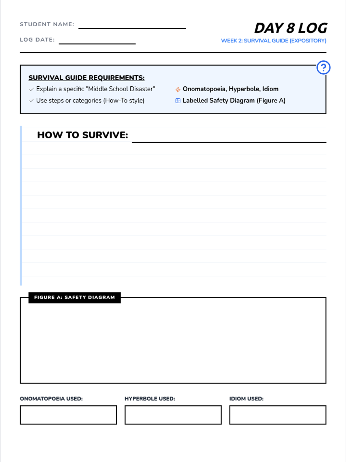 A diary-styled expository writing worksheet for Week 2, where students create a 'survival guide' using onomatopoeia, hyperbole, and idioms.