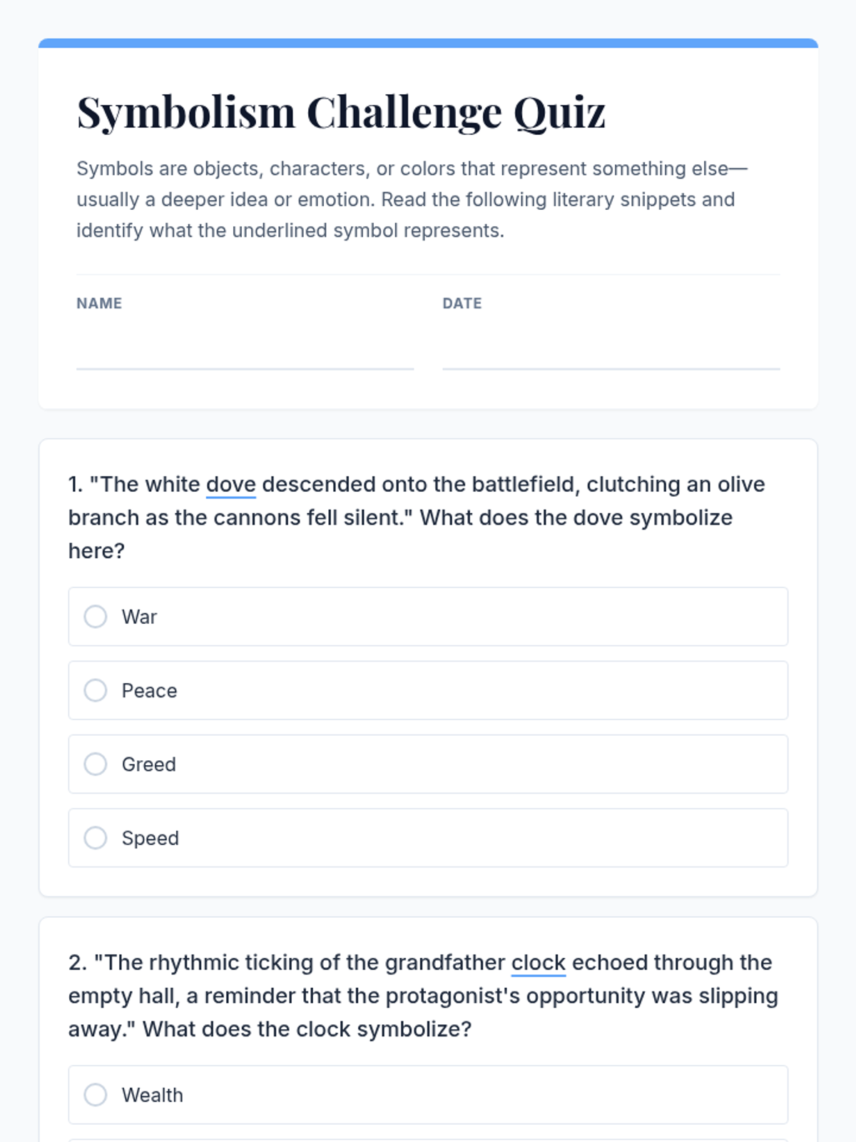 A multiple-choice and short-answer quiz testing students' ability to identify and interpret literary symbols within short contextual sentences, based on common universal symbols. Revised for improved page-breaking and styling uniformity. Finalized with grid layouts for better space utilization and consistent theme styling.