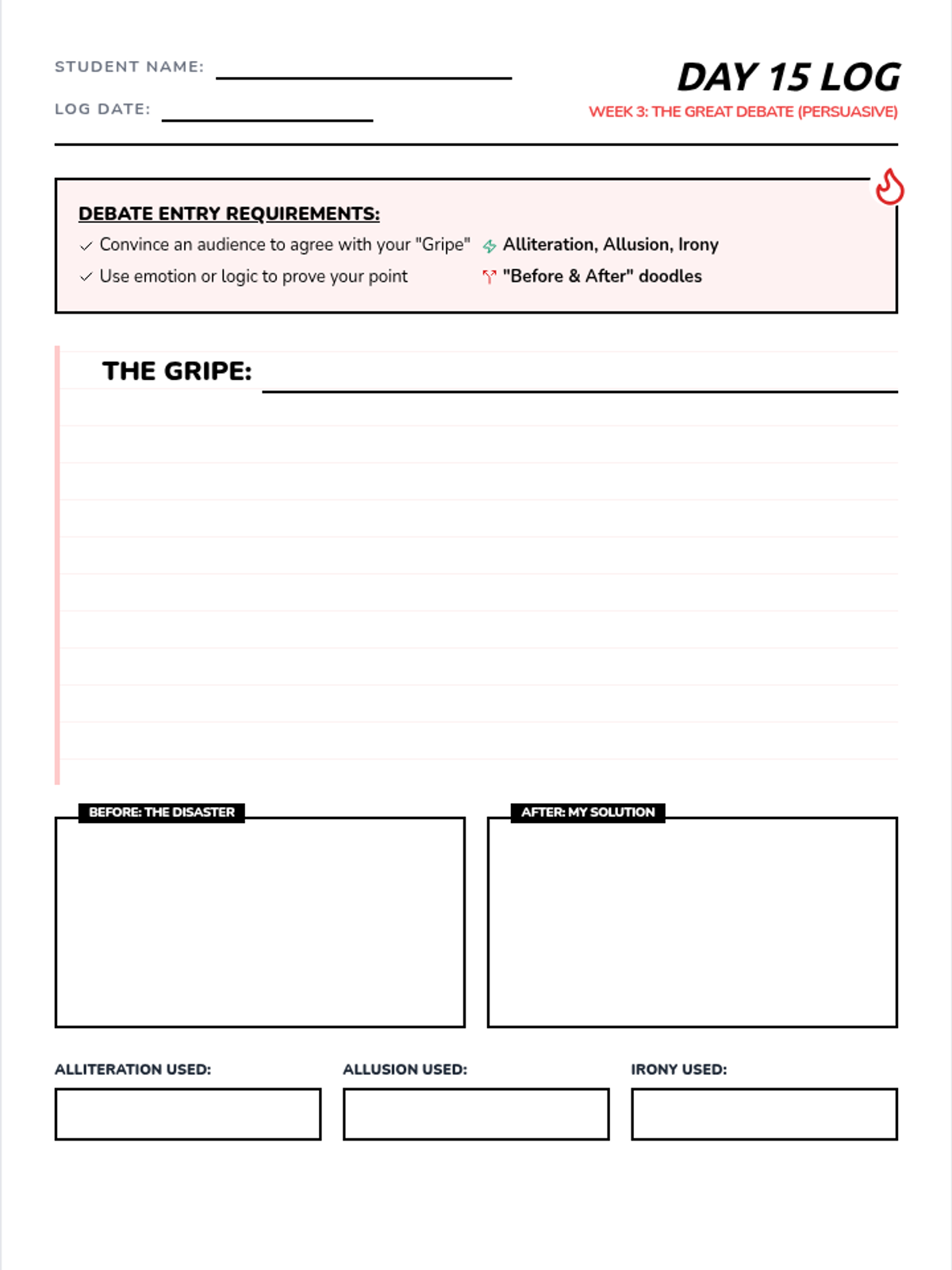 A diary-styled persuasive writing worksheet for Week 3, where students argue for a change using alliteration, allusion, and irony.