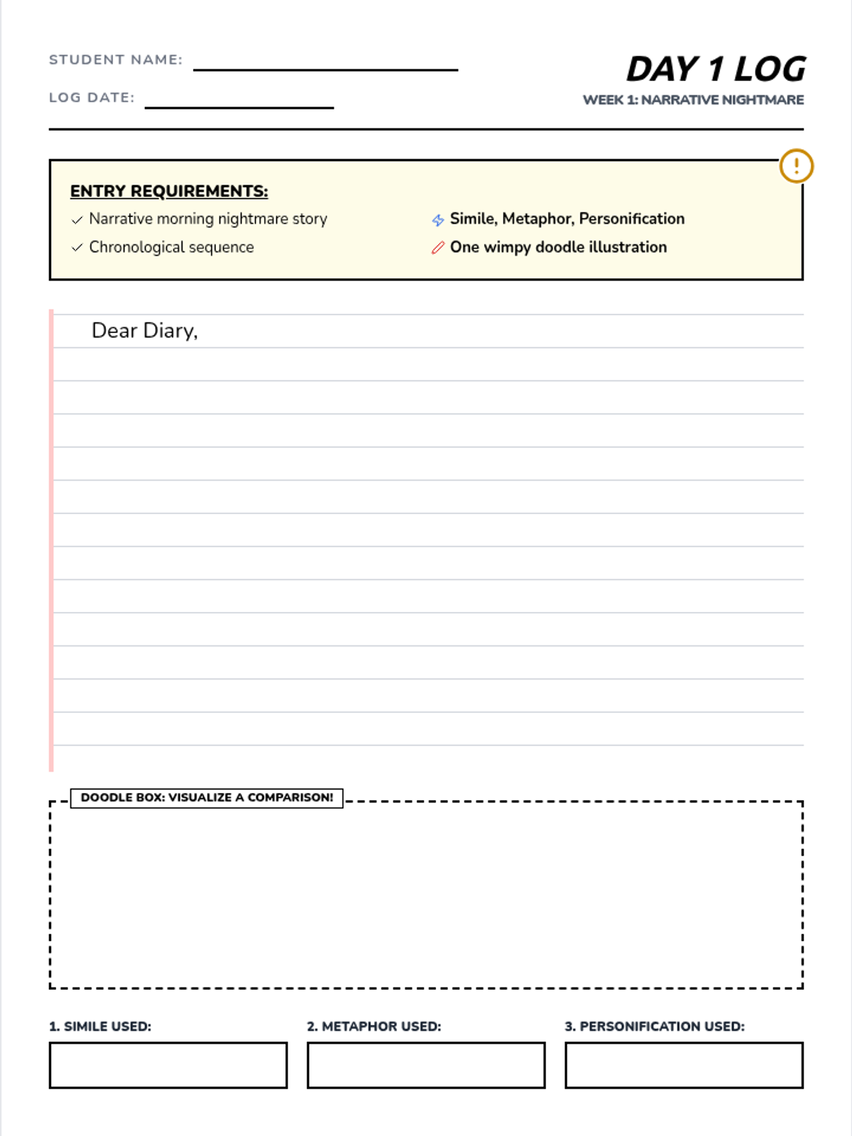 A student worksheet designed as a diary page for Week 1, prompting a narrative entry and the use of simile, metaphor, and personification, complete with a doodle space.