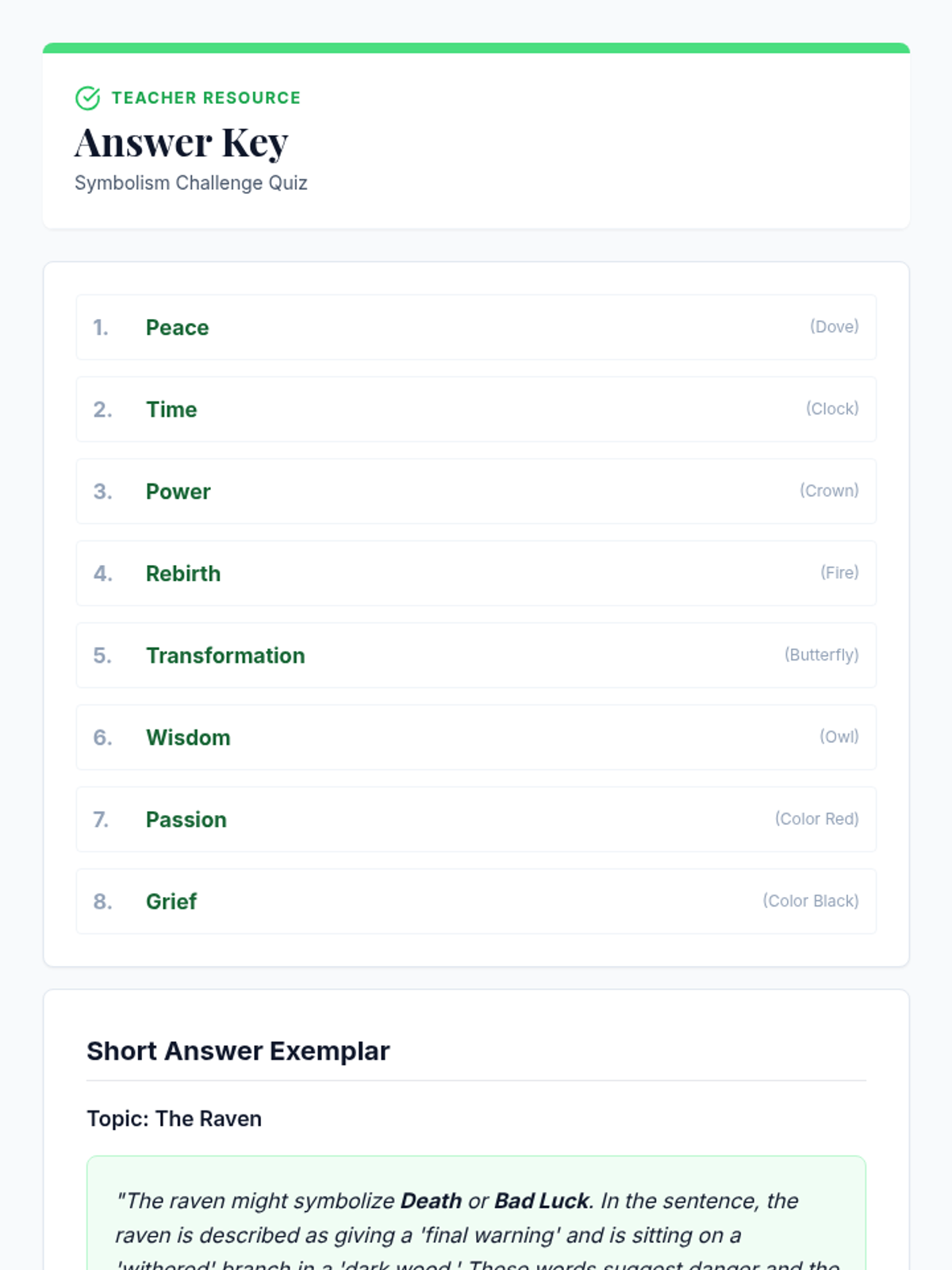 A teacher's answer key for the Symbolism Challenge Quiz, providing correct multiple-choice answers and an exemplar response for the short-answer section. Revised for contrast and page-breaking.