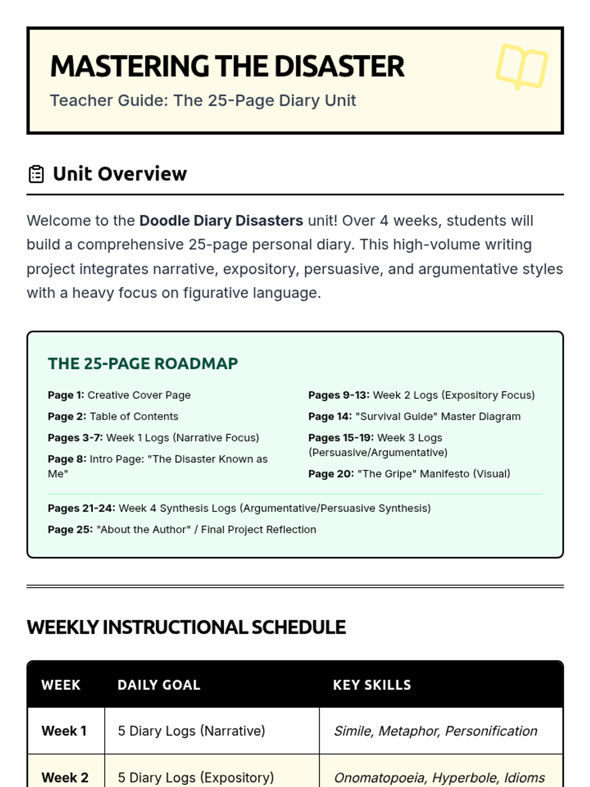 A teacher guide providing a 4-week overview of the Doodle Diary Disasters unit, including weekly focus areas for writing types and figurative language.